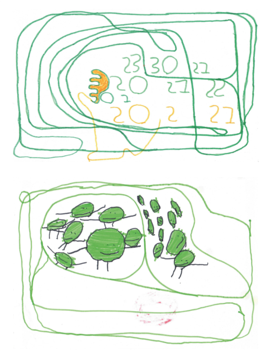 A few months after the start of the therapy, the child’s vocabulary had expanded significantly, a simple phrase had appeared, and speech had begun to be communicative. But the most noticeable result was observed in the emotional dimension and behavior: the child became much calmer, aggression and affective outbursts disappeared, which made it possible to completely discontinue neuroleptics. The dramatic development of cognitive functions was reflected in the child’s drawings (Figures 3, 4). Before therapy, the patient’s drawings had been monotonous and non-objective. Thanks to the development of attention, perception, and fine motor skills, the child began to develop reading and writing skills.