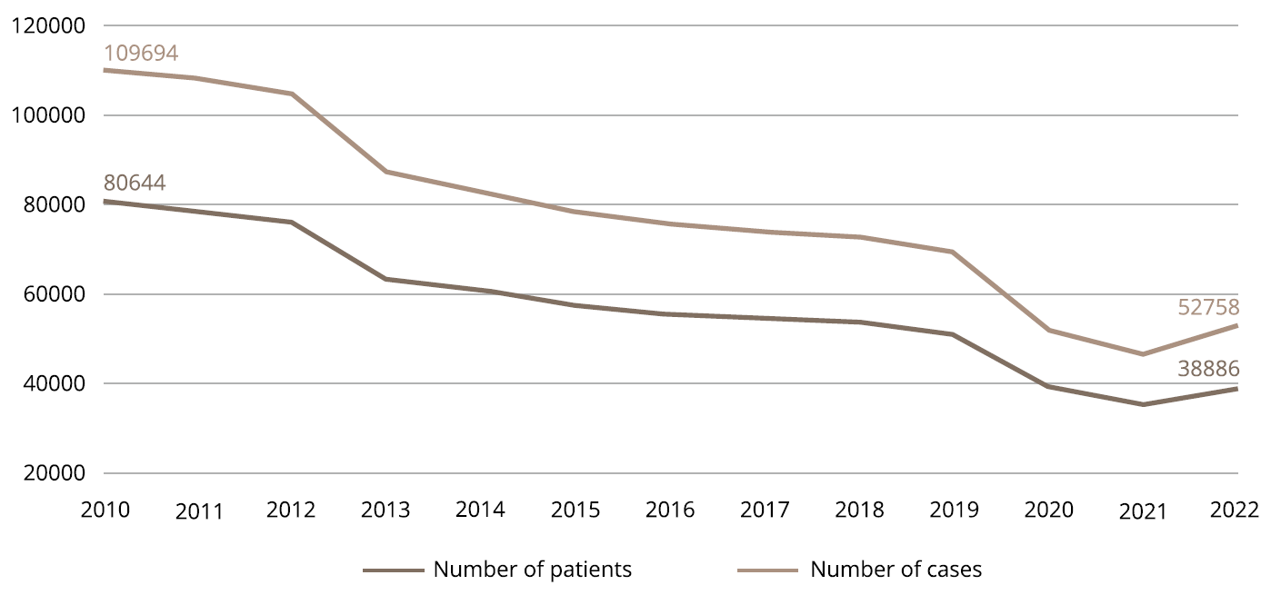 Figure 2. Psychiatric inpatient turnover in the health care system (for 10 million people) of Hungary 2010–2022.