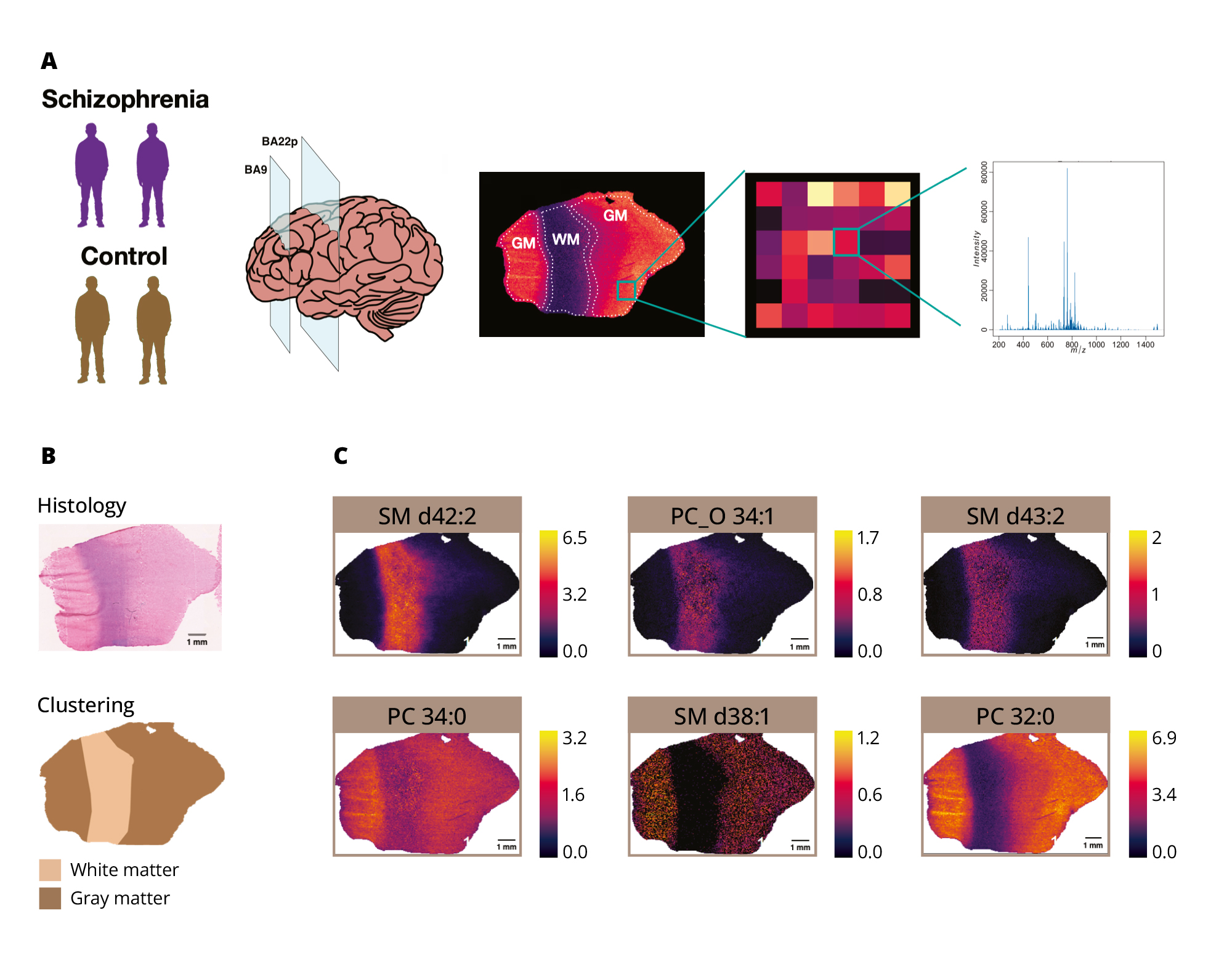 Schizophrenia is a psychiatric disorder affecting 0.3 to 0.45% of the global population1 [1, 2] and up to 4.7% in selected countries [3, 4], with a significant social and healthcare impact [2]. The molecular underpinnings of schizophrenia remain poorly understood due to the multifactorial nature of the disease and brain tissue heterogeneity. Recent advances in high-resolution molecular imaging techniques, such as Matrix-Assisted Laser Desorption/Ionization Mass Spectrometry Imaging (MALDI-MSI), offer unprecedented opportunities to elucidate the spatial distribution of molecules on tissue sections [5–7], thereby enabling a more comprehensive understanding of the biochemical changes associated with schizophrenia [8]. Studying molecular changes in other disorders using MALDI-MSI provides a powerful approach to identifying and localizing potential biomarkers [9], in an effort towards a better understanding of disease etiology [10, 11].