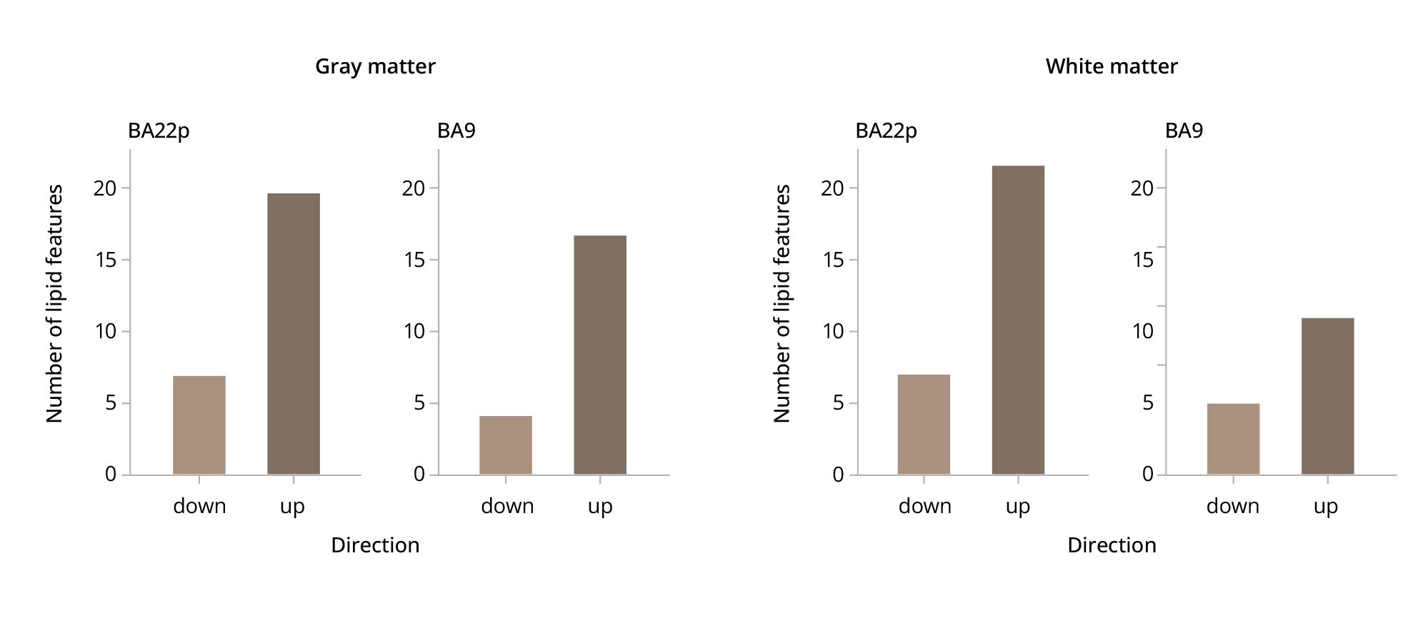 RESULTS: Our findings revealed an uneven distribution of schizophrenia-related lipid alterations across the two neocortical regions. The BA22p showed double the differences in its subcortical white matter structures compared to BA9, while less bias was detected in the gray matter layers. While the schizophrenia-associated lipid differences generally showed good agreement between brain regions at the lipid class level for both gray and white matter, there were consistently more discrepancies for white matter structures.