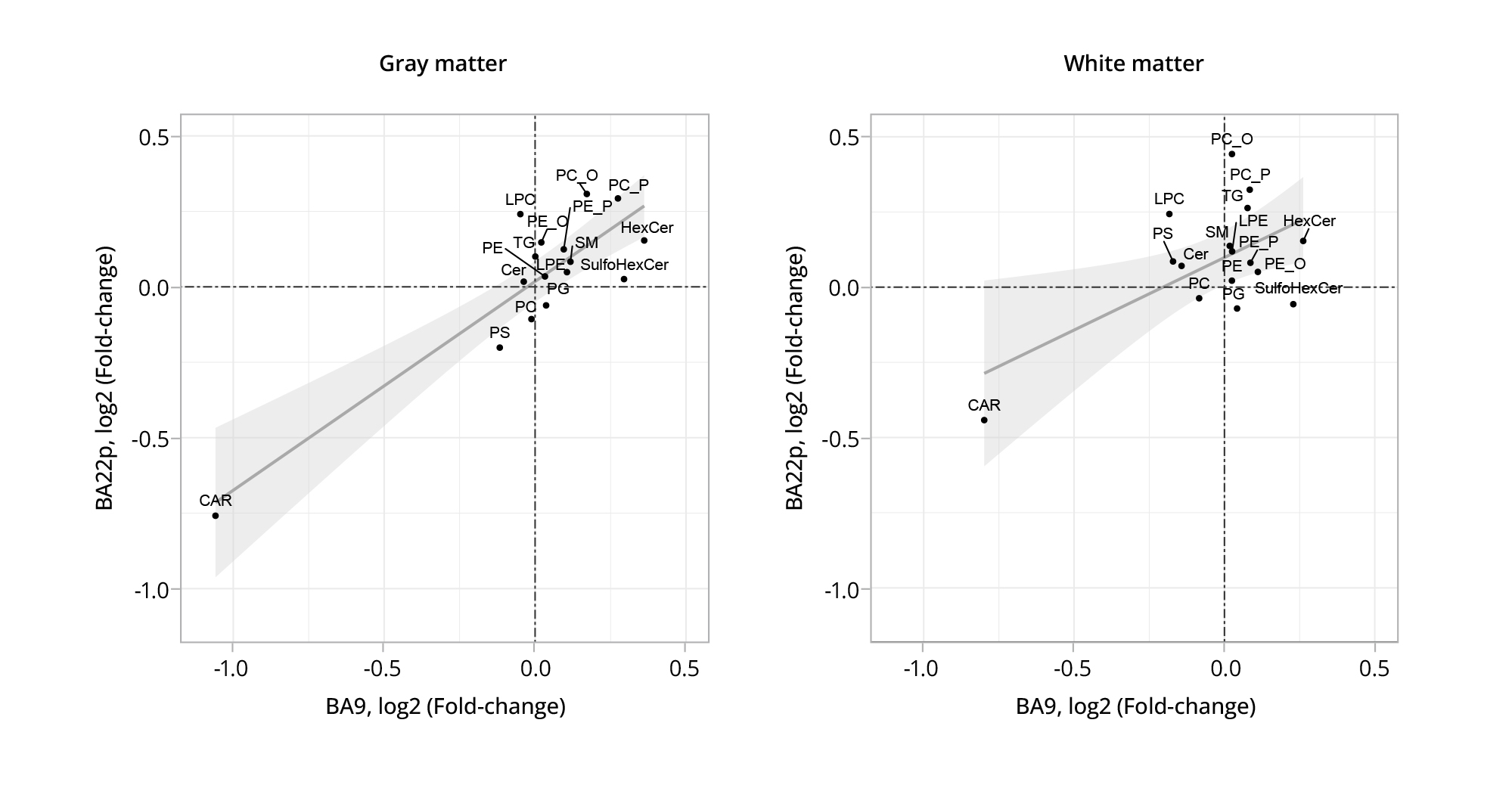 Note: Each point signifies the average difference (fold-change) in lipid intensity levels between the schizophrenia and control samples, calculated for all lipids within a specific lipid class in either the BA9 (x-axis) or BA22p (y-axis) brain region section. Linear regression lines are drawn with 95% confidence intervals represented by gray shaded areas.