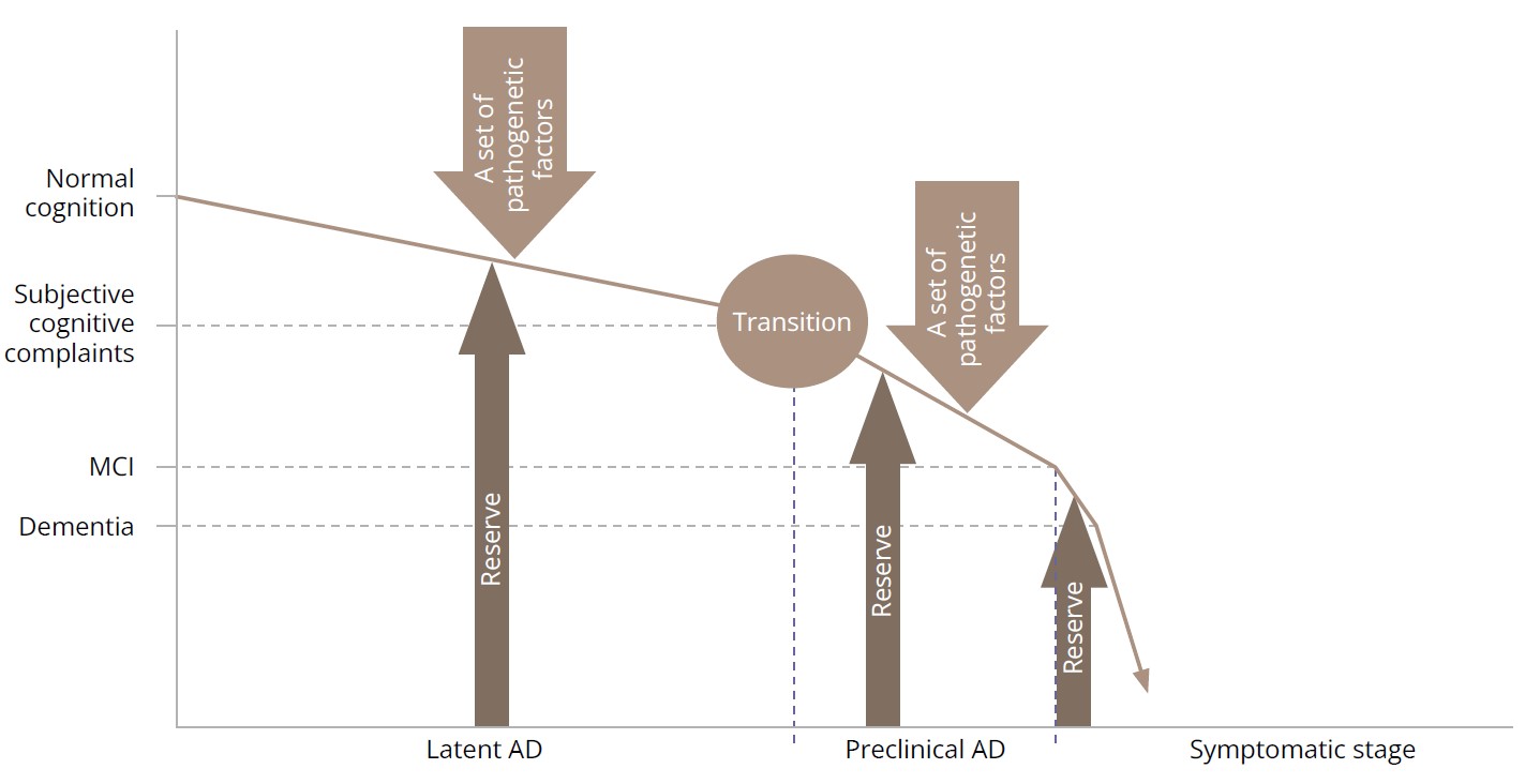 RESULTS: The modern understanding of AD as a biological continuum covering the preclinical, prodromal, and clinical phases of the disease makes it possible to infer that insufficiency of protective factors underlies the progression of AD. The cognitive reserve is involved in the sanogenetic protective mechanism during neurodegeneration. The cognitive reserve is a theoretical concept that reflects modern research’s understanding of how the integrative functioning of the brain (cerebral) and cognitive reserves extend the period of active intellectual longevity through energy-saving mechanisms. It considers these mechanisms as central to healthy mental activity and in slowing the progression of neurodegenerative diseases. At some point, an increase in excess interneuronal activity that reflects the hypercompensatory function of the reserve would accelerate the depletion of brain structures and contribute to clinical and psychopathological manifestations of AD.