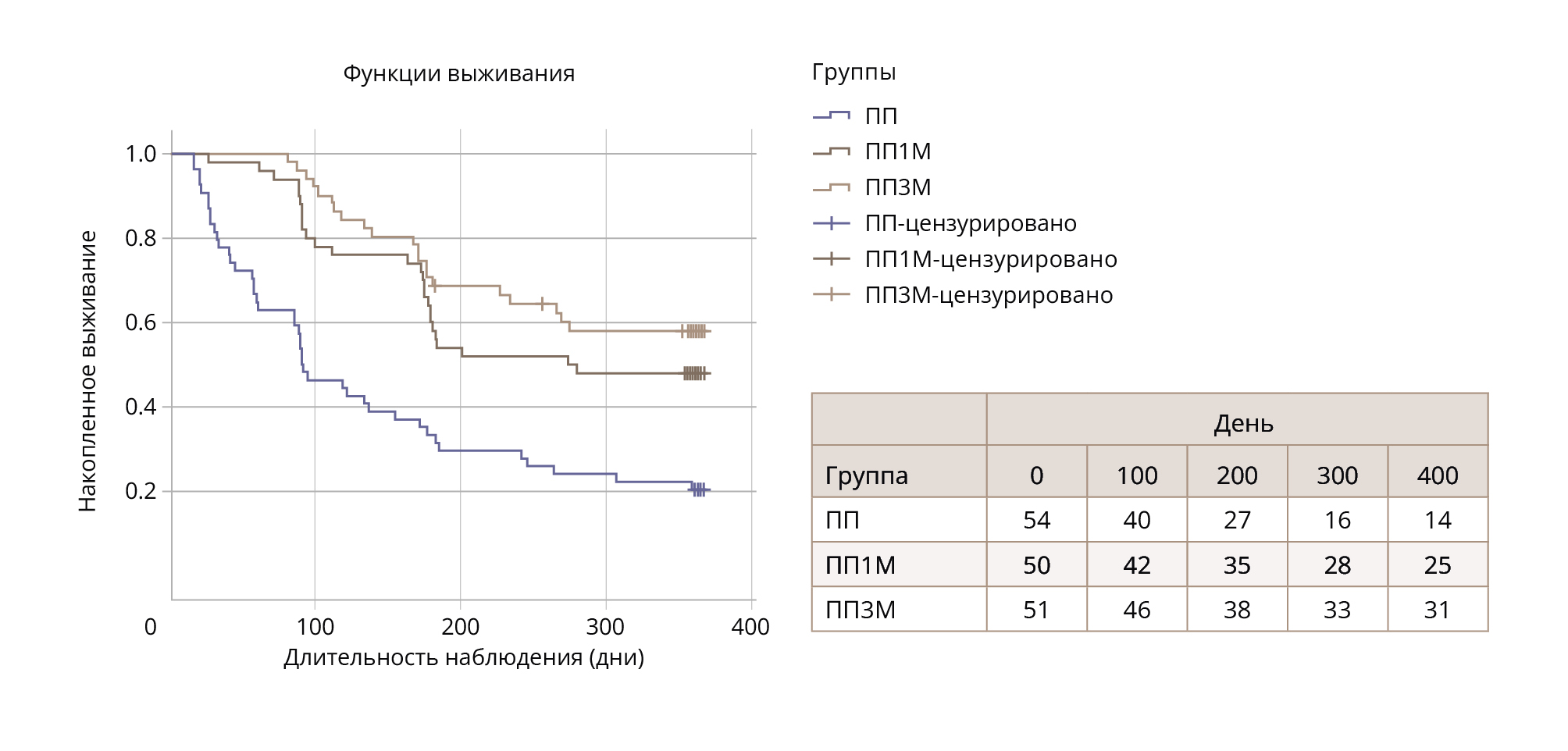 Анализ различия времени досрочного завершения исследования проводился с помощью анализа кривых выживаемости Каплана–Мейера (Kaplan–Meier) со сравнением различий между группами с помощью Logrank-теста, вычислением средней продолжительности участия в исследовании для каждой из групп и показателя относительного риска для полного завершения исследования.