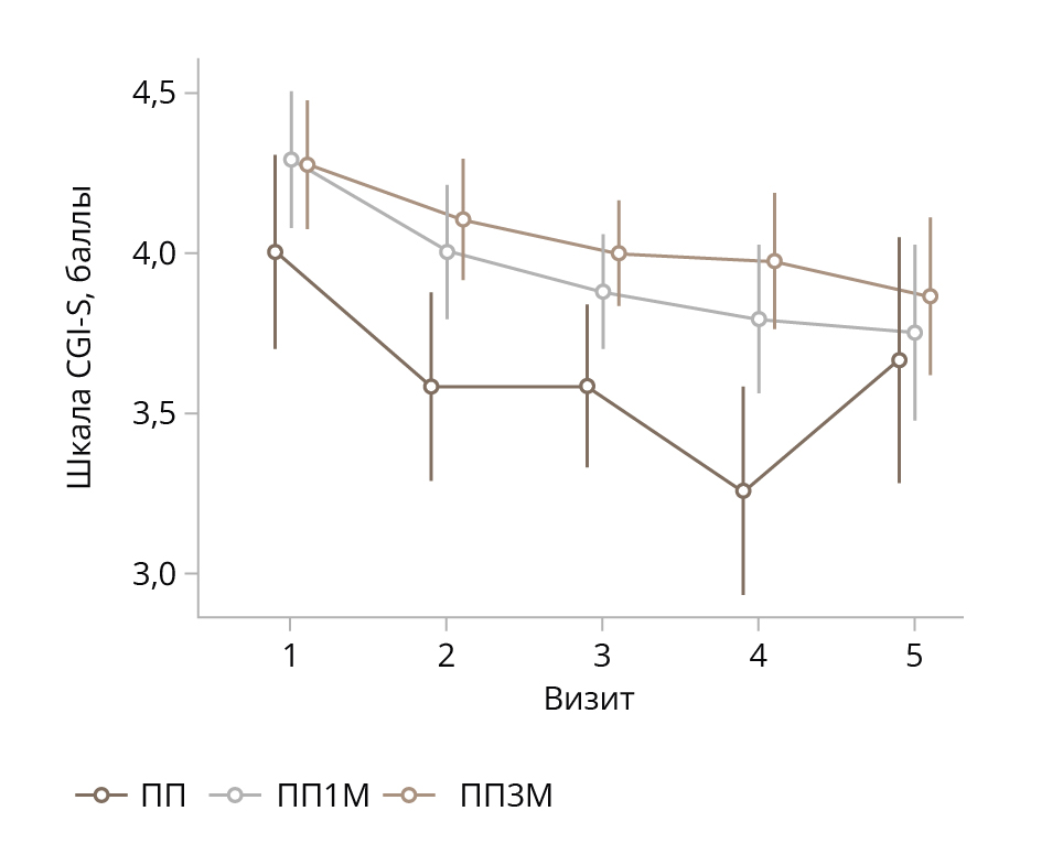 ЗАКЛЮЧЕНИЕ: Терапия различными лекарственными формами палиперидона обеспечивает примерно равный темп и интенсивность редукции общей тяжести шизофрении, позитивных и негативных симптомов. В группе ПП3М наблюдалось лучшее соблюдение назначенной схемы терапии и наибольшее количество пациентов, полностью завершивших исследование.