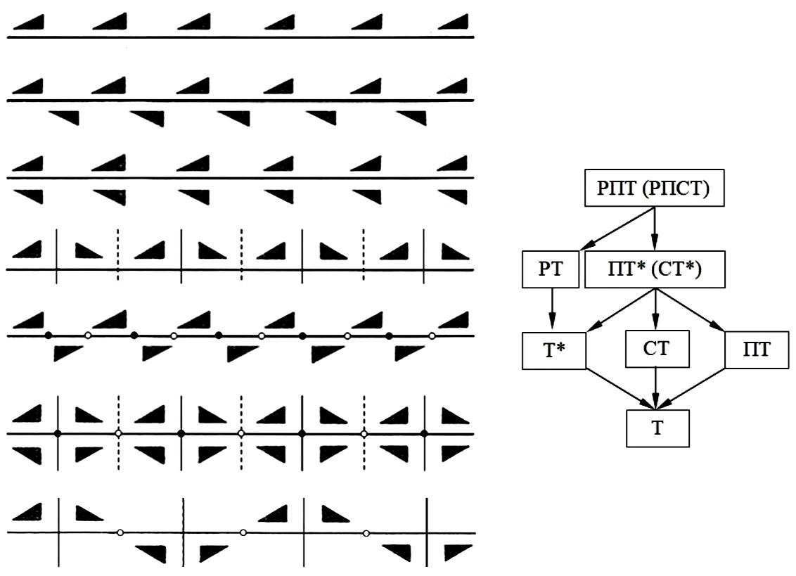 Это кажется невероятным ввиду огромного разнообразия линейных орнаментов, окружающих нас в природе и дизайне. Но все это разнообразие представлено в устройстве исходного элемента, обозначенного на рис. 1 асимметричным треугольником. Сплошными линиями показаны: направление трансляции Т, совпадающий с ним след Р и плоскости П в кластерах, штрихами - дополнительные плоскости П, появляющиеся между кластерами в силу теорем. Черными кружками показаны центры инверсии С в кластерах; белыми - дополнительные центры между ними. Каждый бордюр назван минимально достаточным или полным списком порождающих операций симметрии (Войтеховский, 2020).