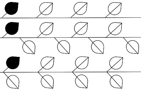 Кристаллографические бордюры - односторонние орнаменты. Именно это позволяет использовать их для описания ритмичных расположений листьев (у которых верхняя, то есть обращенная к солнцу, сторона радикально отлична от нижней) на горизонтальной ветке, когда все они условно лежат в одной плоскости. Но возможны варианты: 1) лист расположен косо к ветке по ходу ее роста, и тогда неважно, симметричен он или асимметричен; 2) лист ортогонален к ветке, и тогда важно, он симметричен (2а) или асимметричен (2б). Случай 1 согласуется с бордюрами Т, Т* и РТ (рис. 2). Черным показан лист, с которого начинается построение бордюра. Другие варианты противоречивы - в них правильное положение листа сочетается с обратным. В случае 2а лист состоит из асимметричных половинок, связанных плоскостью П, и с точки зрения теории бордюров должен рассматриваться как кластер. Он сочетается с бордюрами ПТ, ПТ*, СТ и РПТ (рис. 3). Бордюры ПТ* и СТ похожи. Но в ПТ* каждый нижний (верхний) лист расположен строго посередине между верхними (нижними). В СТ кластер из двух противоположно ориентированных листьев транслируется на произвольный шаг. Случай 2б с точки зрения симметрии сводится к варианту 1.