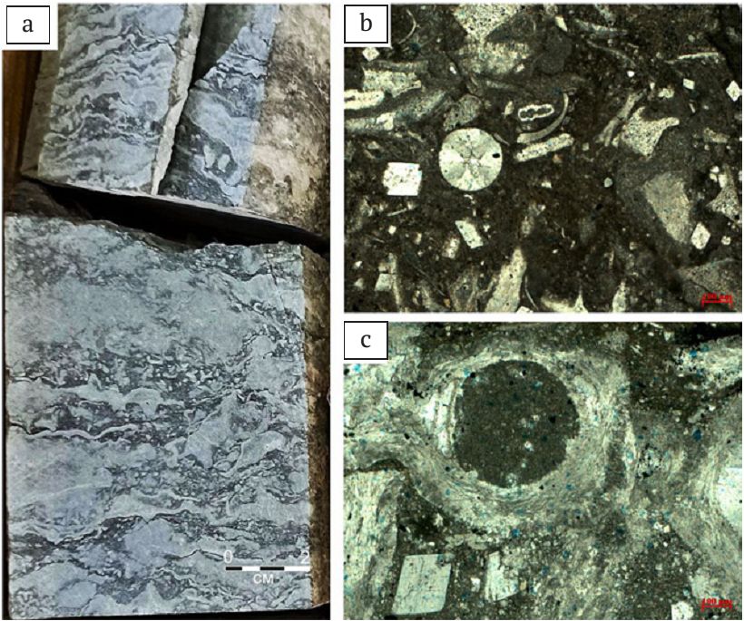 Рис. 2. Известняк нодулярный: a — фрагмент кернового материала; b — контакт микритового нодуля (вакстоуна) с доломитизированным матриксом (шлиф, николи //); c — то же, николи +, линейка 0.2 мм