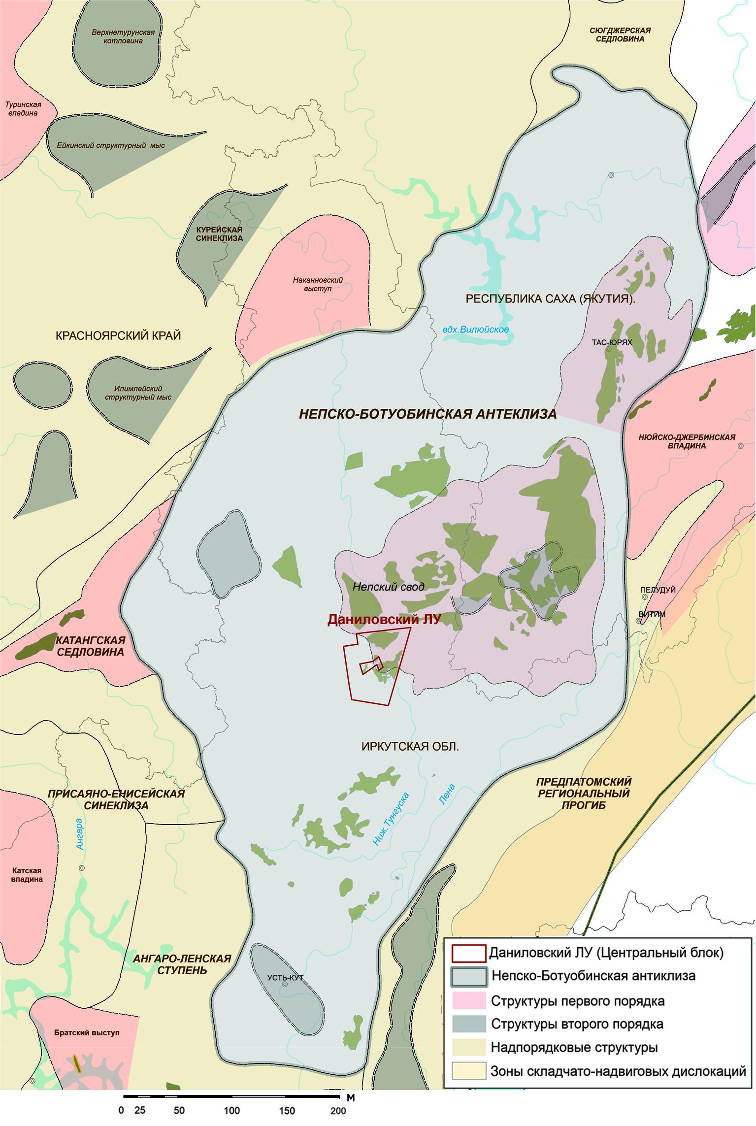 Рис. 1. Тектоническая карта Непско-Ботуобинской антеклизы c границами Даниловского лицензионного участка (Мельников, 2017)