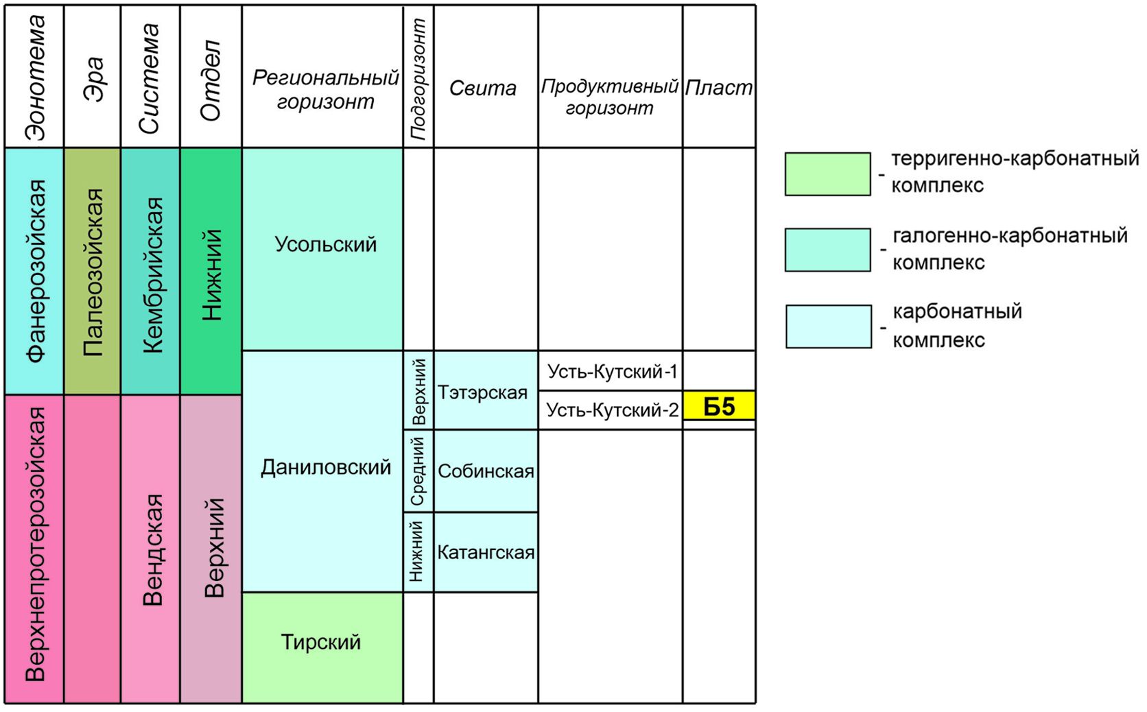 В соответствии с ныне действующей стратиграфической схемой (Мельников, 2017) усольский горизонт нижнего кембрия подстилается отложениями даниловского горизонта, относящегося к венд-кембрийской нерасчлененной толще. В объеме даниловского горизонта выделены катангская, собинская и тэтэрская свиты. В пределах тэтэрской свиты, относящейся к секвенции III порядка, выделяется усть-кутский продуктивный горизонт (Вараксина, Хабаров, 2015). Горизонт делится на два нефтегазоносных пласта, разделенных глинистой пачкой. Нижний усть-кутский 2-й подгоризонт соответствует пласту Б5, который представляет собой мелеющий кверху элементарный циклит и продуктивность которого связана с карбонатными породами (рис. 2, 4).