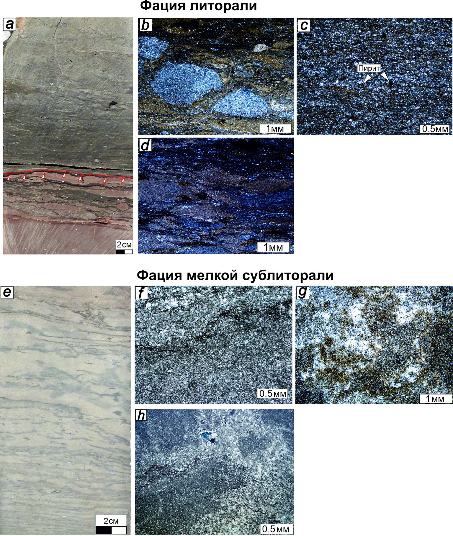 Фация литорали. Фото керна: a) нижняя граница парасеквенции — контакт слабосульфатизированных доломитов и доломитов глинистых. Фото шлифов: b) доломит глинистый с карбонатными и глинистыми гальками, фиксирующими трансгрессивную поверхность; c) доломит микрокристаллический глинистый; d) доломит глинистый литокластовый с частыми глинистыми прожилками. Фация мелкой сублиторали. Фото керна: е) доломит микрокристаллический со структурой мадстоун. Фото шлифов: f) доломит тонкомикрокристаллический со структурой мадстоун с глинистыми прожилками; g) доломит микротонкокристаллический сульфатизированный со структурой мадстоун; h) доломит тонкомикрокристаллический со структурой мадстоун со стилолитами