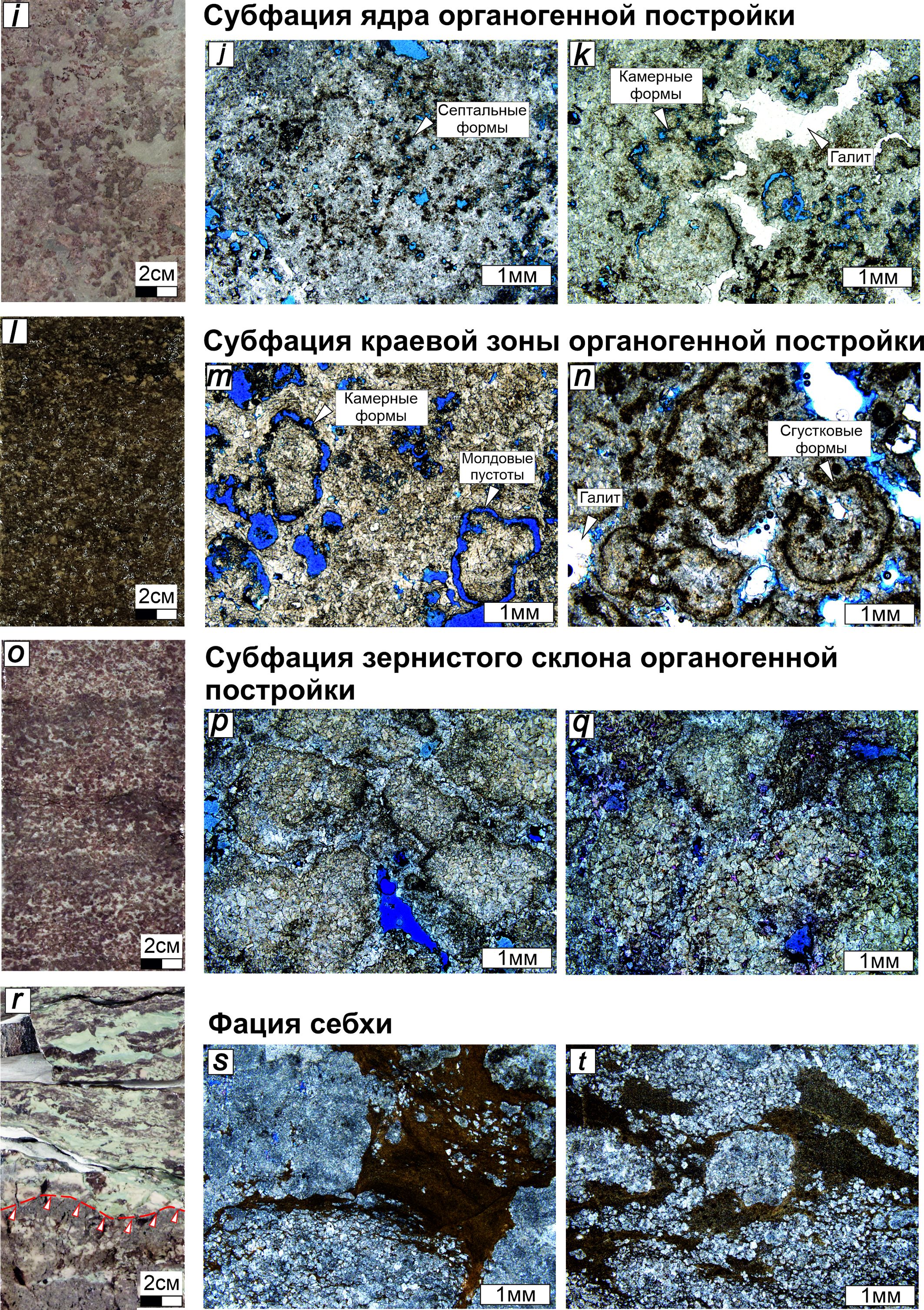 Субфация ядра органогенной постройки. Фото керна: i) доломит микротонкокристаллический с микробиальной структурой баундстоун, с микритовым межскелетным заполнением вакстоун, с массивной текстурой. Фото шлифов: j) доломит микротонкокристаллический со структурой баундстоун, образованный септальными формами микробиолитов; k) доломит микротонкокристаллический со структурой баундстоун, образованный камерными формами микробиолитов. Субфация краевой зоны органогенной постройки. Фото керна: l) доломит тонкокристаллический с микробиальной структурой баундстоун, с зернистым межскелетным заполнением пакстоун, с массивной текстурой. Фото шлифов: m) доломит тонкокристаллический со структурой баундстоун, образованный камерными формами микробиолитов; n) доломит тонкокристаллический со структурой баундстоун, образованный сгустковыми формами микробиолитов. Субфация зернистого склона органогенной постройки. Фото керна: o) доломит тонкомикрокристаллический разнозернистый со структурами грейнстоун и рудстоун. Фото шлифов: p) и q) доломит литокластово-фитокластовый разнозернистый со структурой рудстоун, с пологонаклонной текстурой. Фация себхи. Фото керна: r) верхняя граница парасеквенции — контакт разнообломочной доломитовой брекчии с сульфатно-карбонатно-глинистым цементом и доломитов глинистых сульфатизированных. Фото шлифов: s) и t) доломитовая брекчия с сульфатно-карбонатно-глинистым цементом