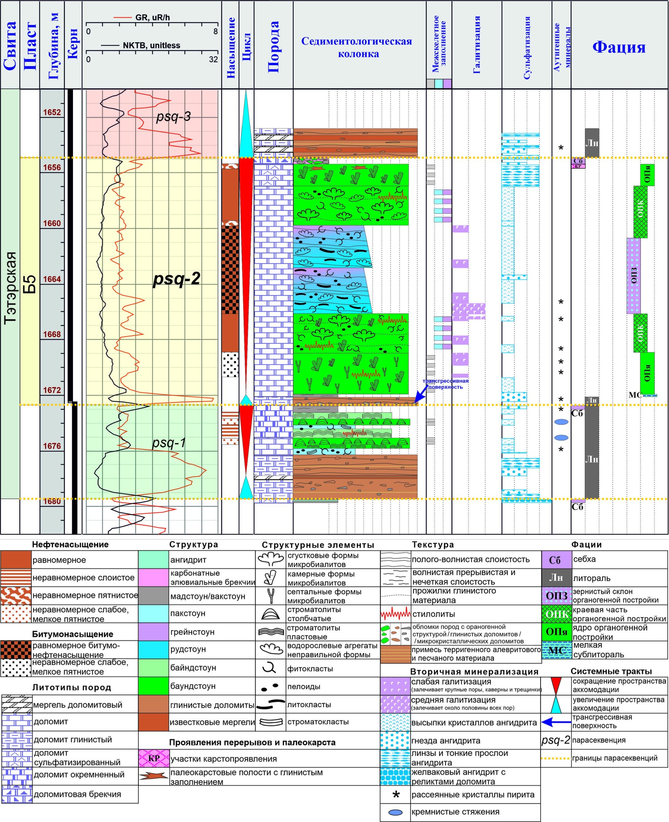 Отложения пласта Б5 представляют собой мелеющую кверху парасеквенцию (psq-2), являющуюся составной частью секвенции III порядка, слагающей тэтэрскую свиту. В процессе аналитической работы в цикле пласта Б5 выделены нижняя (рис. 3, а) и верхняя (рис. 3, r) границы парасеквенции, прослежены этапы увеличения и сокращения пространства аккомодации. Кровлей и подошвой парасеквенции psq-2 являются поверхности морского затопления.