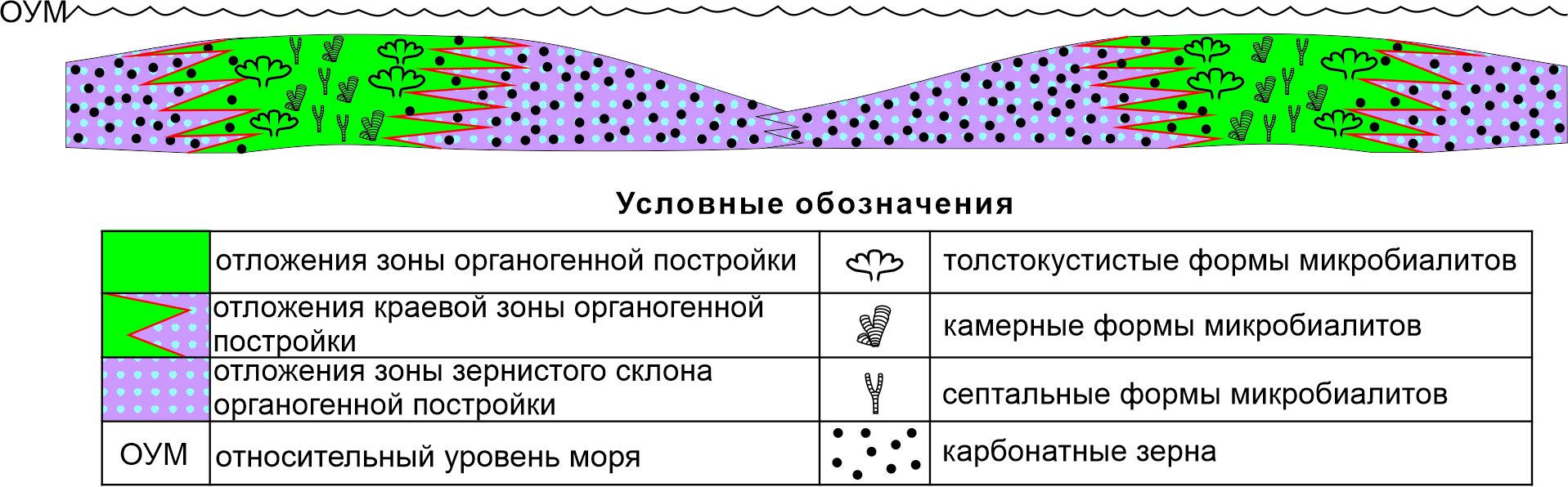 Рис. 5. Седиментационная модель строения мелководно-шельфовых органогенных построек тэтэрской свиты венд-кембрийского времени
