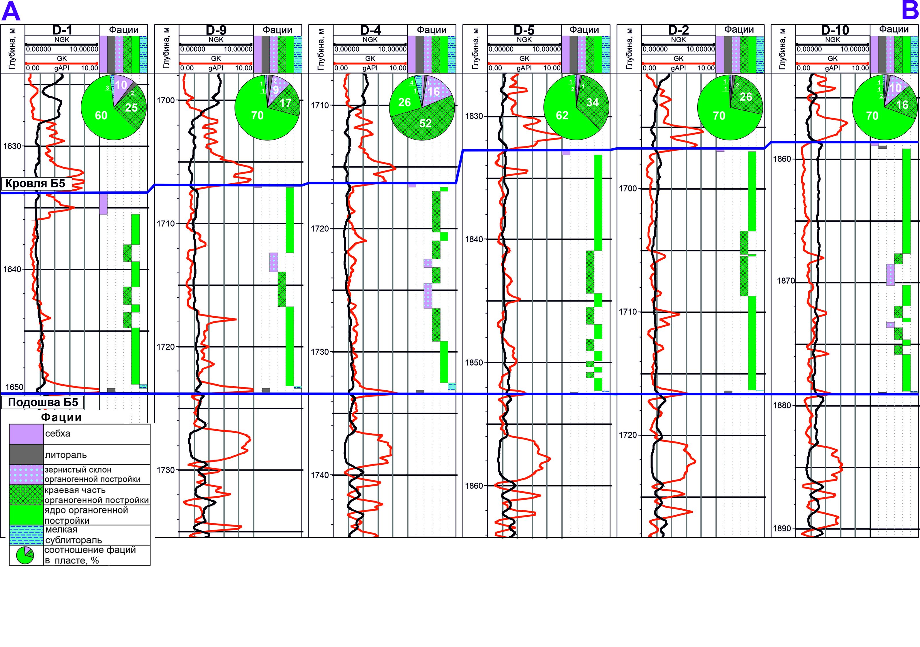 Рис. 8. Схема корреляции скважин Даниловского ЛУ по линии AB с отображением фациальной изменчивости пласта Б5