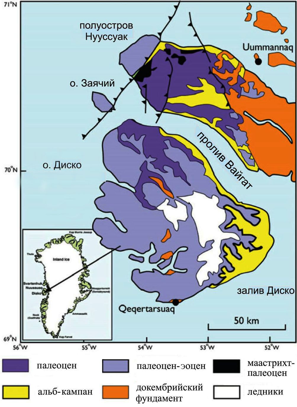 Рис. 1. Геологическая карта полуострова Нууссуак, о. Диско и о. Заячий (Dam et al., 2009)