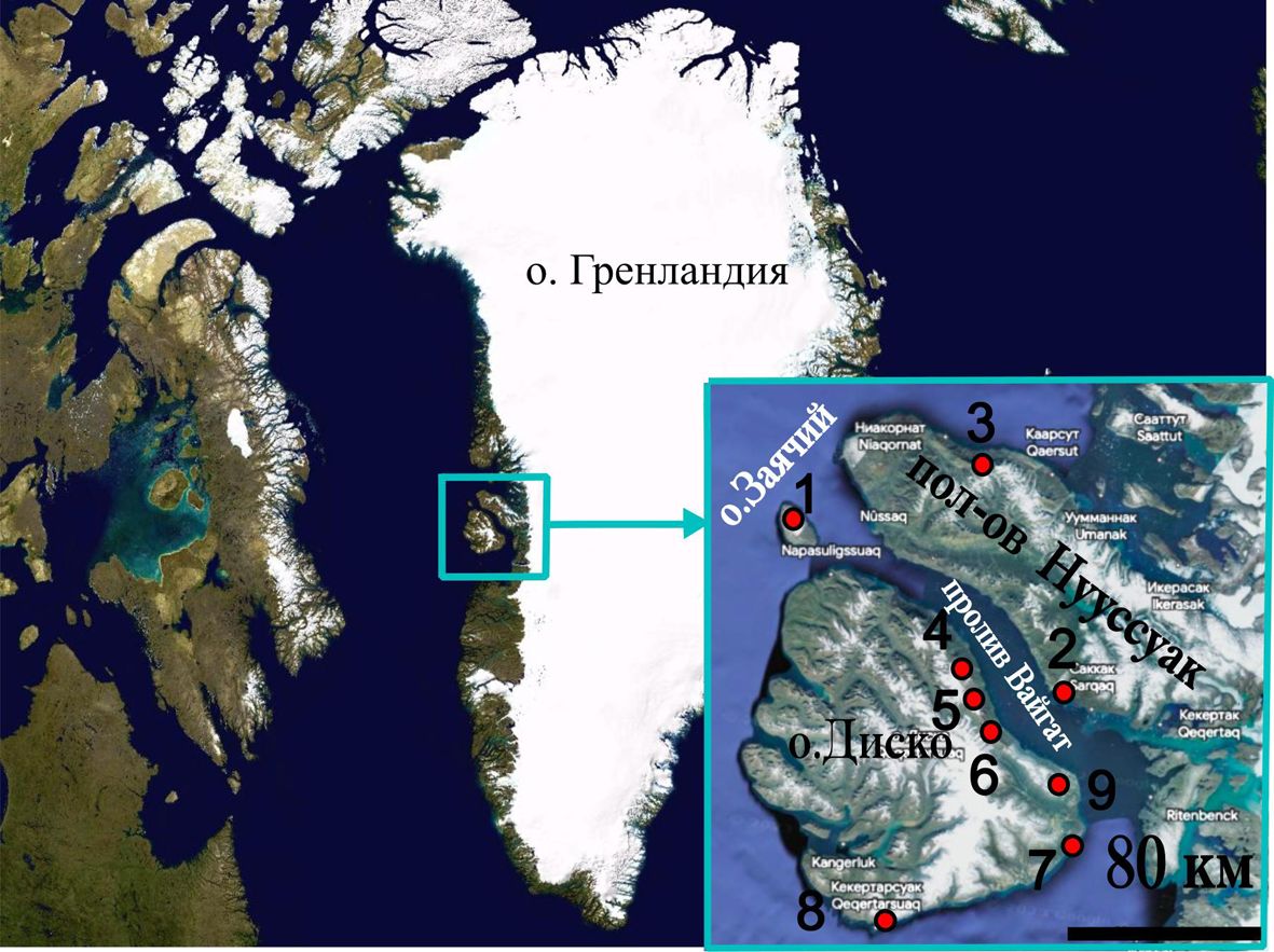 Рис. 2. Места находок ископаемых смол арктической части Дании (о. Гренландия): 1 — о. Заячий; 2 — Атанекердлук; 3 — мыс Экоргфат; 4 — Кудлисат; 5 — Унартуварсок; 6 — Уджарарсусук; 7 — Флаккерхук; 8 — Кекертарсуак; 9 — Исунгоак