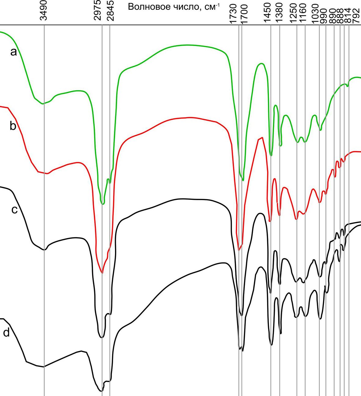 Рис. 3. ИК-спектры ископаемых смол: a — валховита из коллекции Музея Земли в Варшаве, b — шрауфита из проявления Вама, Румыния (Kosmowska-Ceranowicz, 1999), c — ископаемой смолы с о. Заячий (Kosmowska-Ceranowicz, 1999), d — цедарита (чемавенита) с проявления Сидар (штат Манитоба) из коллекции Яна Фудала, США