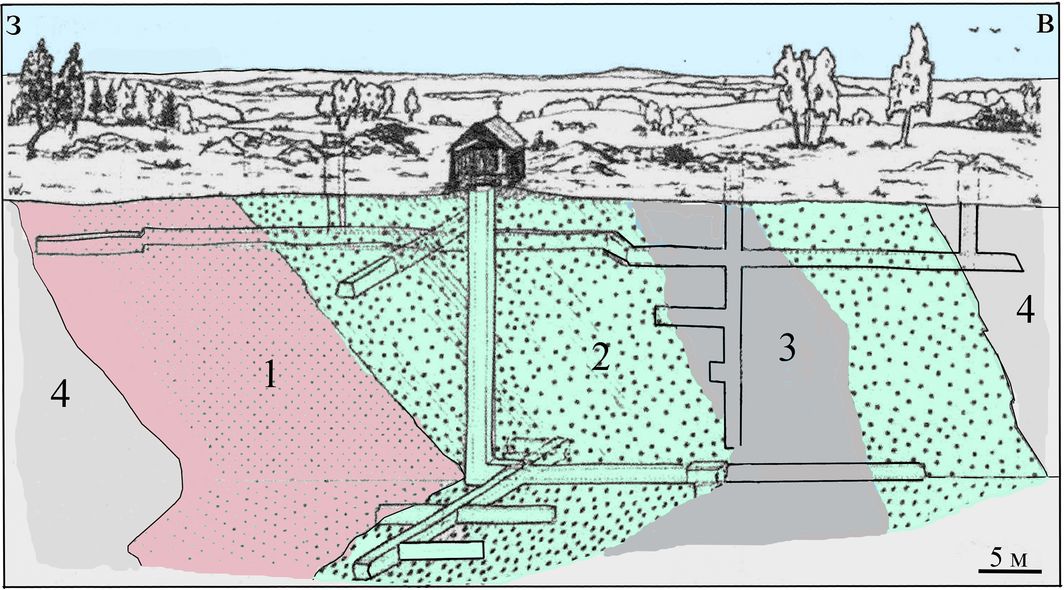 Рис. 1. Схематический широтный геологический разрез в районе разведочного участка на Борисовских (Соколиных) сопках: 1 — гранит, 2 — мусковитовый сланец с кианитом, 3 — кварц-кианит-мусковитовая порода с лимонитом, 4 — мусковит-кварцевый сланец. По данным А. Н. Игумнова и К. Е. Кожевникова (1935), с небольшими изменениями