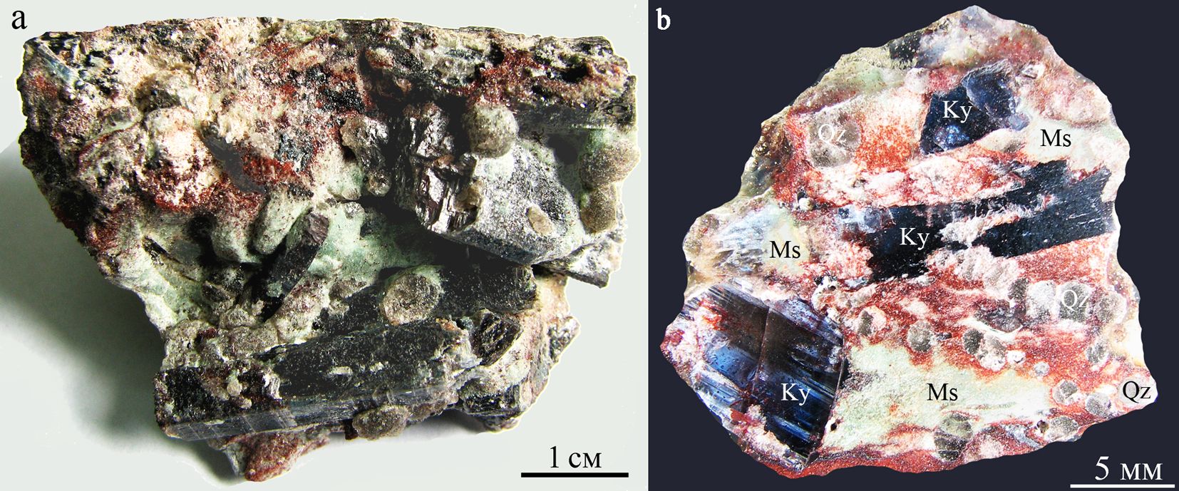Рис. 2. Структура кварц-кианит-мусковитовой породы: а — естественная поверхность; b — полированный препарат. Ms — мусковит, Qz — кварц, Ky — кианит (Борисовские сопки). Образец С. В. Колисниченко; фото В. А. Попова