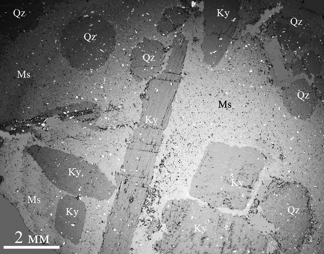 Рис. 3. Неравнозернистая структура кварц-кианит-мусковитовой породы. Ms — мусковит, Qz — кварц, Ky — кианит. BSE-фото