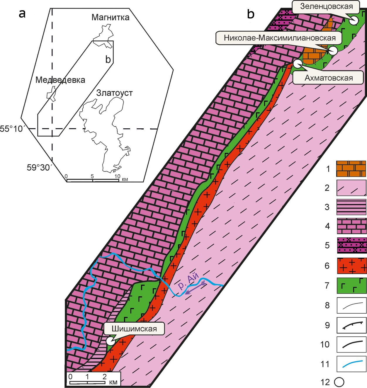 Рис. 1. Географическая (a) и геологическая (b) схемы района работ (построены В. С. Стативко на основе Госгеолкарты-200/2 листа N-40-XII (Аулов и др., 2015) с упрощениями). Условные обозначения: 1 — доломиты, известняки (D1tr); 2 — сланцы слюдисто-хлоритовые, слюдисто-кварцевые, полевошпат-кварцевые, филлиты и др. (RF2kv); 3 — аргиллиты и алевролиты (RF1bk); 4 — доломиты и доломитовые известняки, доломиты песчанистые и глинистые и др. (RF1st); 5 — песчаники полевошпат-кварцевые (RF1as); 6 — граниты (yRF2kk2); 7 — габбро, габбро-нориты, горнблендиты, клинопироксениты (vRF2kk1); 8 — контакт пород; 9 — надвиги; 10 — разломы; 11 — водоемы; 12 — минеральные копи