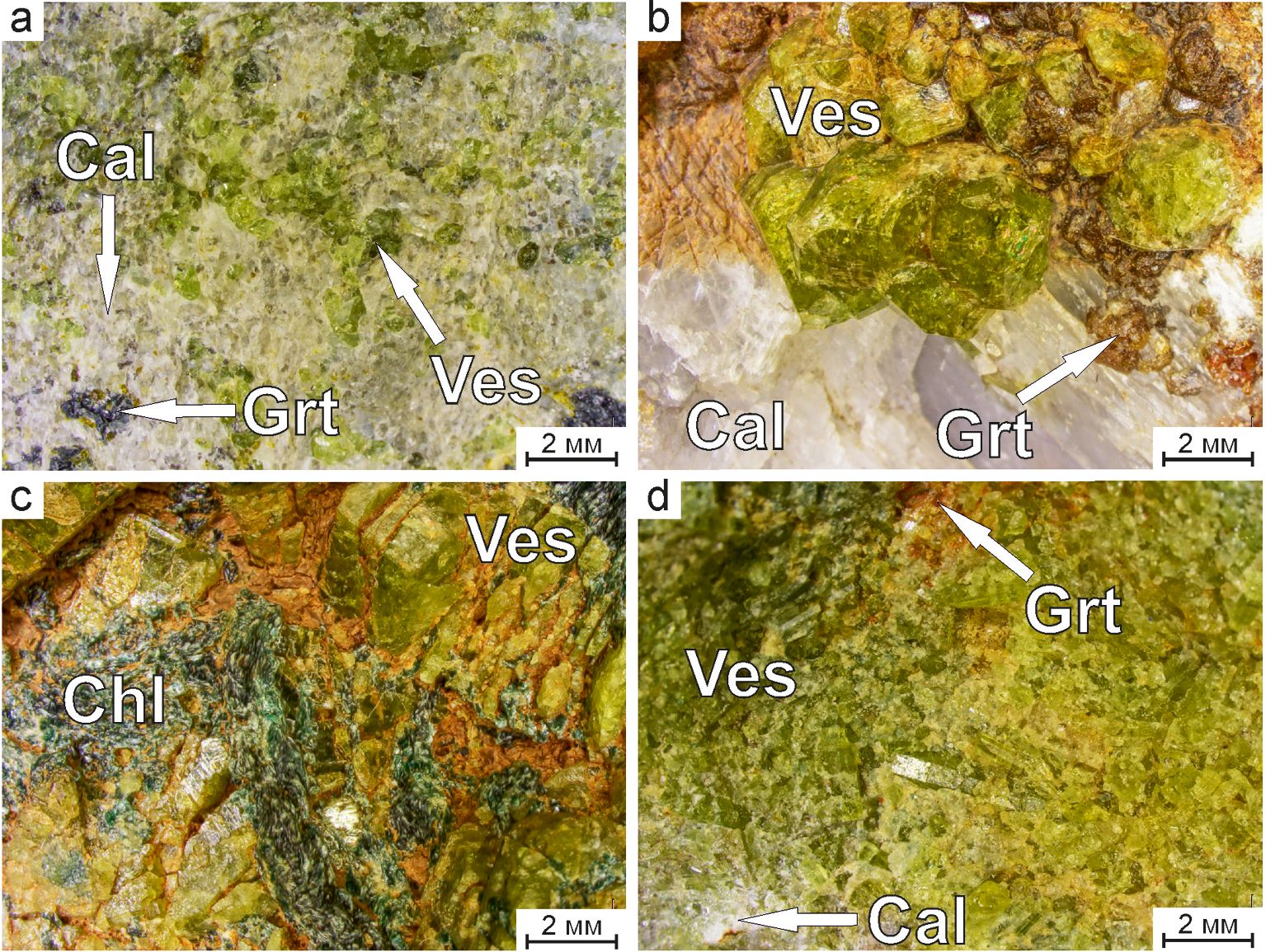 Рис. 2. Минералы группы везувиана в различных минеральных ассоциациях (копи): a — с гранатом и кальцитом (Зеленцовская); b — с гранатом и кальцитом (Николае-Максимилиановская); c — с клинохлором (Ахматовская); d — с кальцитом и гранатом (Шишимская). Аббревиатуры минералов (здесь и далее): Cal — кальцит; Chl — хлорит (клинохлор); Grt — гранат- андрадит-гроссулярового ряда