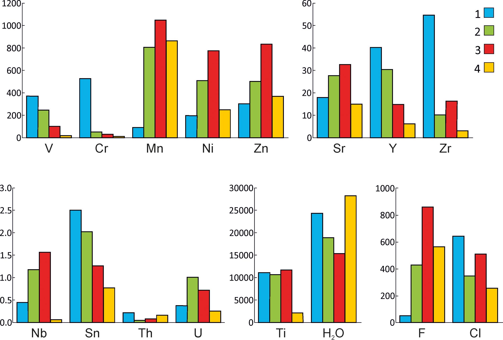 Примечательно, что от центра к периферии этих кристаллов содержание Y, H2O, F и Cl уменьшается, а V, Cr, Ni и Zn увеличивается. Везувиан из жилы (ассоциация с гранатом и кальцитом) в хлоритовом сланце (Николае-Максимилиановская копь) среди всех рассматриваемых везувианов обладает максимальной концентрацией U и минимальной Th. При этом в направлении от центра к краю зерен содержание Ti, Sn и H2O уменьшается, а V, Zr, Nb и Zn увеличивается. Везувиан из родингита (парагенезис с клинохлором, Ахматовская копь) характеризуется наибольшими содержаниями Mn, Ni, Zn, Sr, Nb и F, содержание Ti, Cr, Ni, Sr, Y, U и Cl от центра зерен понижается с увеличением концентрации V и F к их периферии. Везувиан из гранат-везувианового скарна (Шишимская копь) обладает максимальным содержанием H2O при минимальных содержаниях Cr, V, Sr, Sn, Y, Zr, Nb, Ti и Cl, от центра к краю кристаллов содержание Zr и U уменьшается, а V и Th увеличивается.