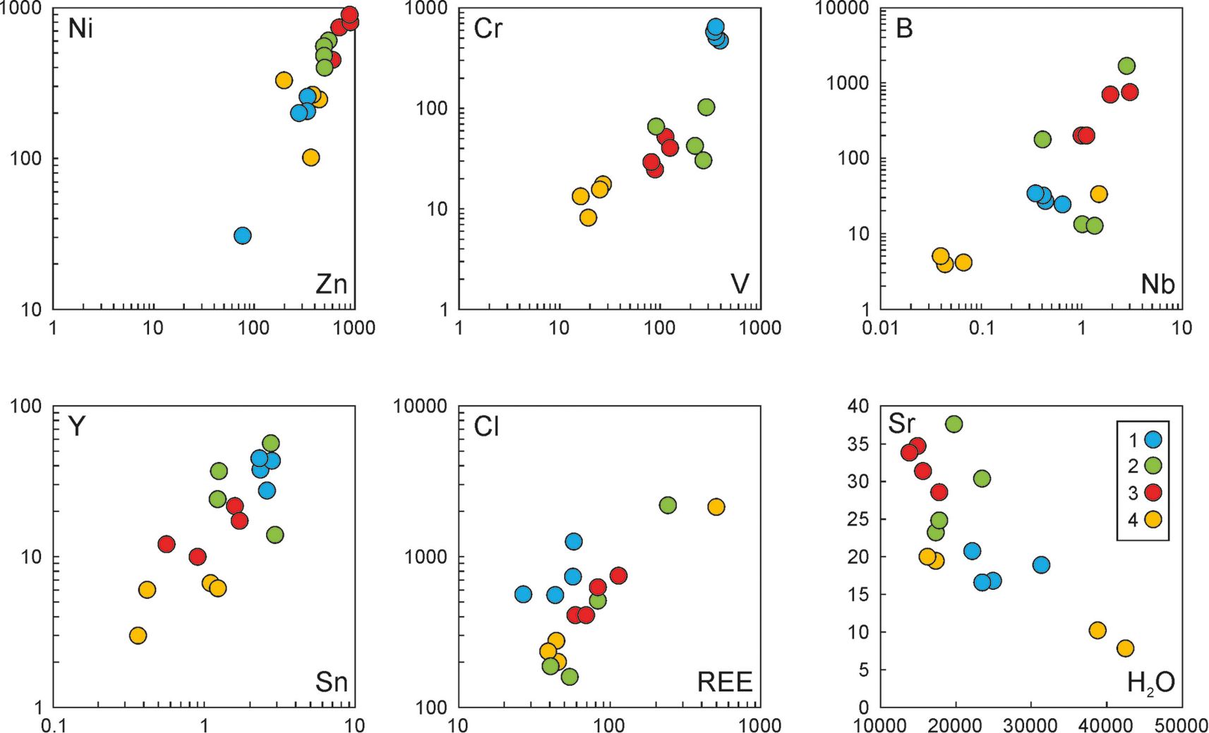 Рис. 4. Бинарные диаграммы содержания (ppm) элементов-примесей и летучих компонентов везувиана различных минеральных ассоциаций (порода, копь): 1 — с гранатом и кальцитом (гранат-везувиановый мрамор, Зеленцовская); 2 — с гранатом и кальцитом (гранат-везувиан кальцитовая жила на хлоритовом сланце, Николае-Максимилиановская); 3 — с клинохлором (родингит, Ахматовская); 4 — с кальцитом и гранатом (гранат-везувиановый скарн, Шишимская)