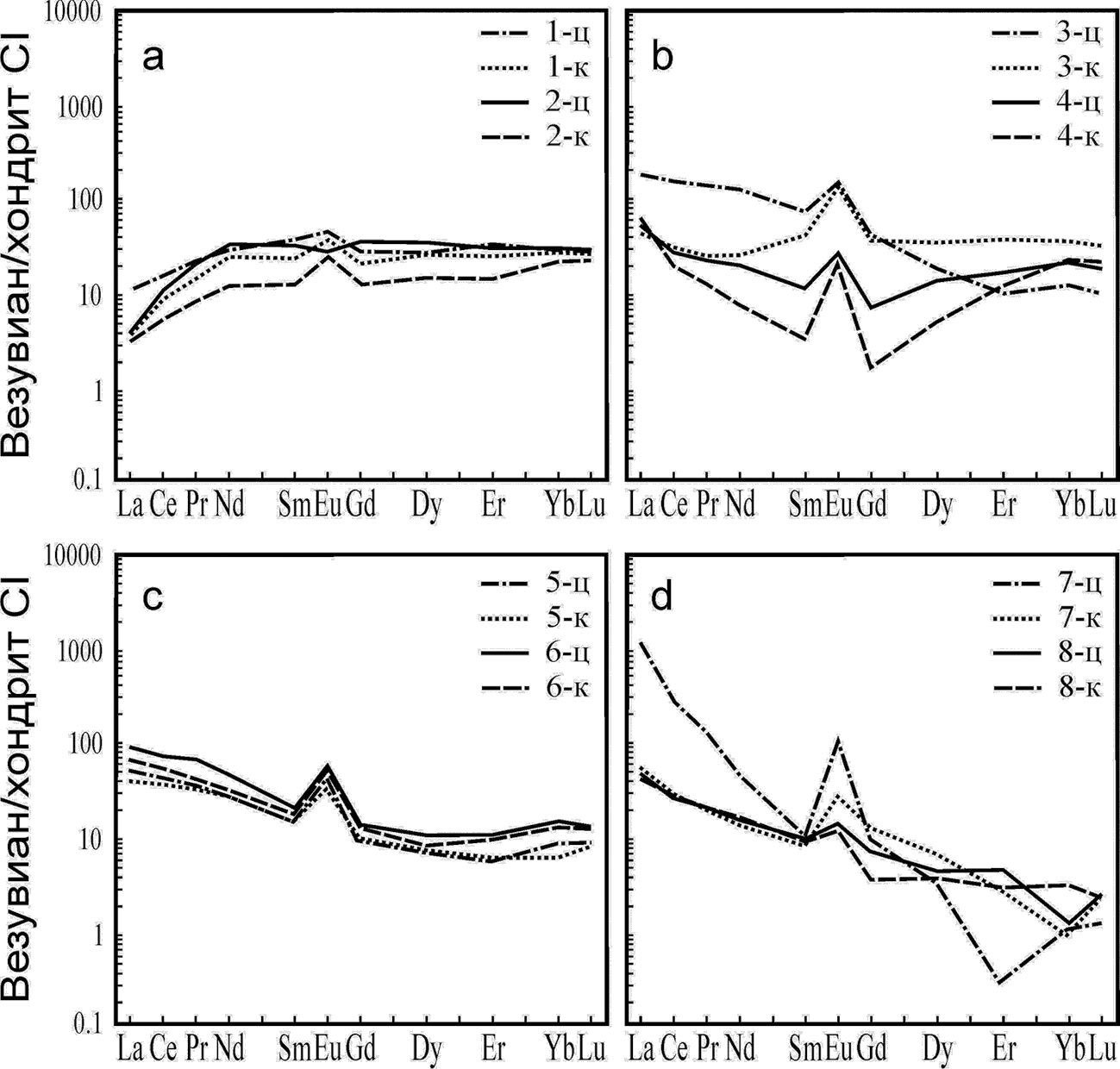 Fig. 5. Distribution spectra of rare-earth elements of vesuvianite in different mineral associations (rock, mine): a — with garnet and calcite (garnet-vezuvianite marble, Zelentsovskaya); b — with garnet and calcite (garnet-vezuvianite-calcite vein on chlorite schist, Nikolaje-Maximilianovskaya); c — with clinochlore (roddingite, Akhmatovskaya); d — with calcite and garnet (garnet-vezuvianite skarn, Shishimskaya)