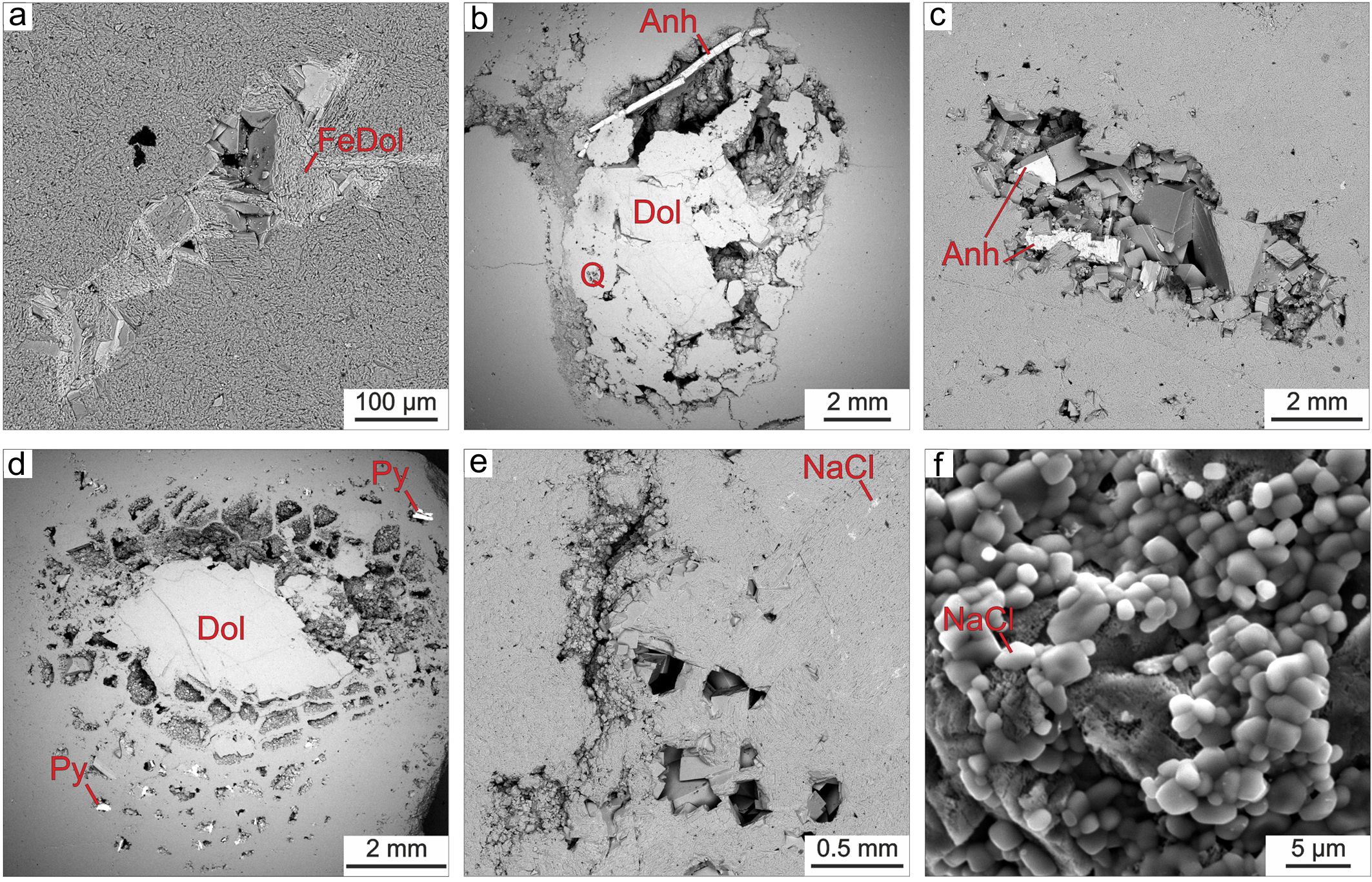 Secondary dolomite cements in leaching voids: dolomite cementing the voids contains an admixture of iron and is characterized by a brighter reflection of crystals or zones of crystals than matrix dolomites (a–d); precipitation of crystalline aggregates of anhydrite (b, c), silicon (b) and pyrite (d) in the cavities; secondary pores of dolomitization and release of sodium chloride in the matrix (e); sodium chloride on the surface of dolomite (f); pictures a–e — in the mode of reflected electrons