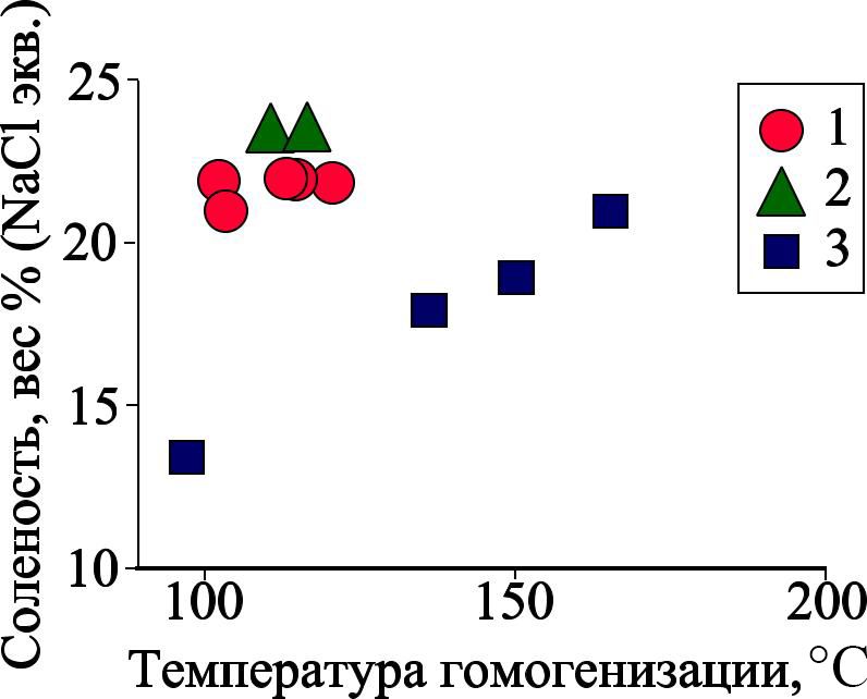 Рис. 6. Соотношение температуры гомогенизации и солености жидкой фазы в флюидных включениях: 1 — в доломите 3/3; 2 — в доломите 13/3; 3 — в ангидрите 3/3