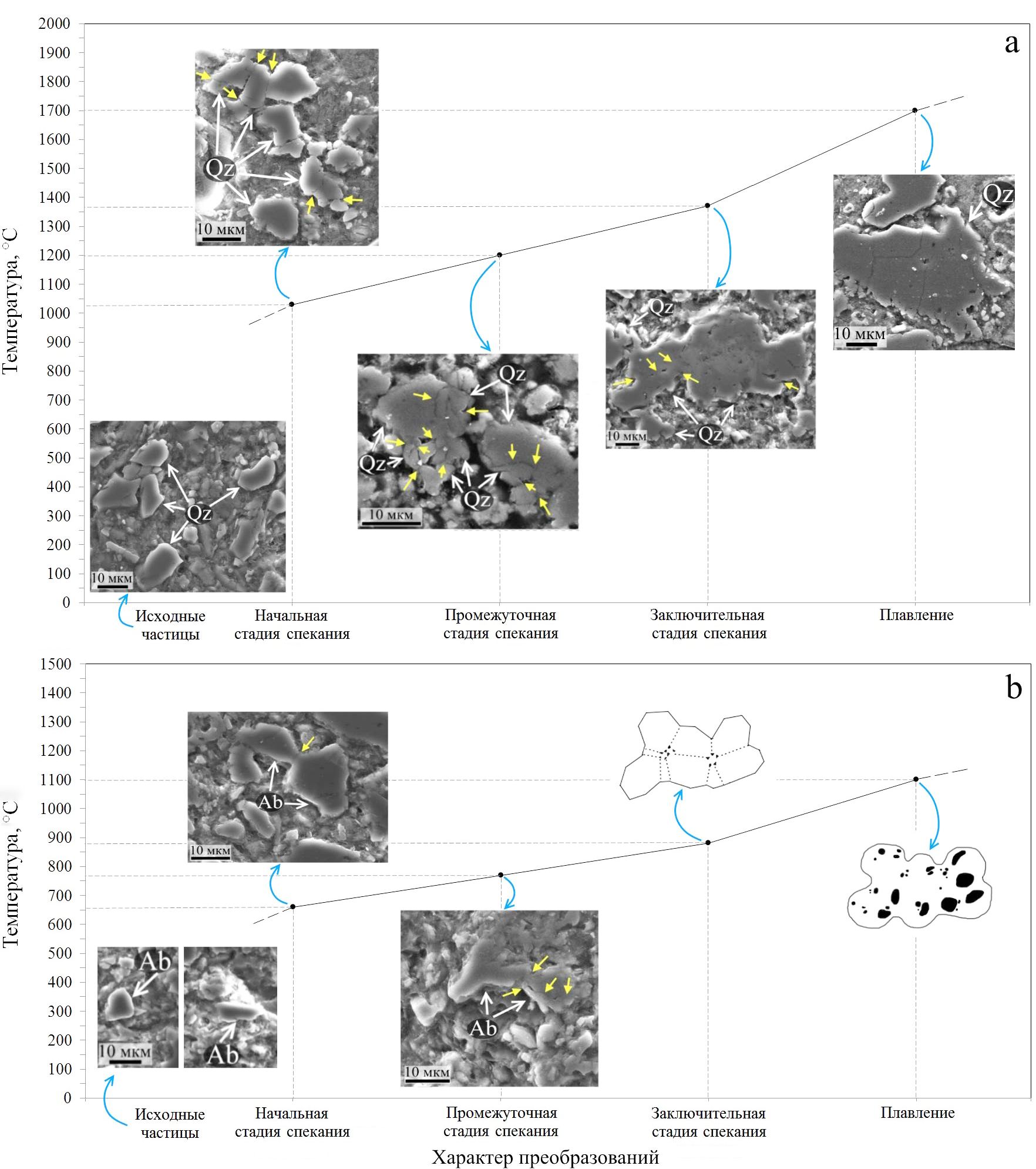 Рис. 7. Схема характера преобразования кварца (a) и альбита (b) в матриксе зювитов Карской астроблемы в зависимости от температуры. Температуры рассчитаны с использованием данных (Navrotsky et al., 1982; He et al., 2021; Chmielewski et al., 2014; Richerson, Lee, 2018). СЭМ-изображения, SE. Желтыми стрелками показано спекание кристаллокластов