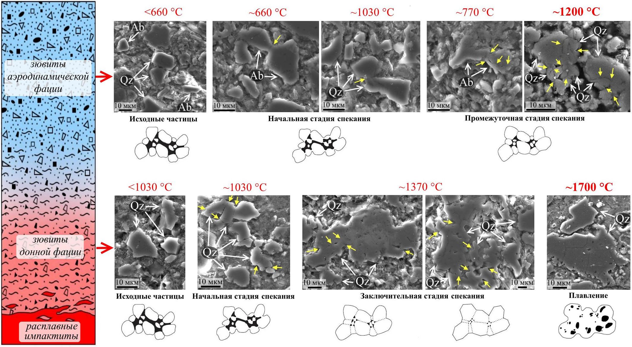 Fig. 8. Nature of matrix sintering and local temperatures of suevite facies formation on the diagram of the section of the coptogenic complex of the Kara astrobleme (out of scale). electron microscopic images, SE. Yellow arrows point to sintering of crystalloclasts