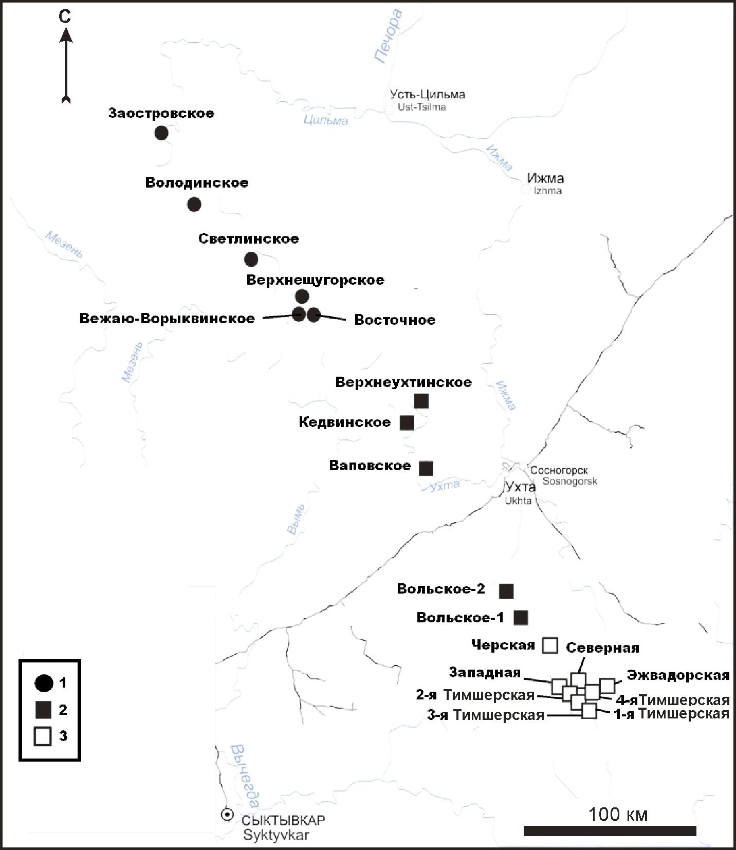 Рис. 1. Схема расположения бокситовых месторождений, коллекции бокситов которых представлены в музее: 1 — Среднетиманские месторождения латеритных бокситов, 2 — Южнотиманские месторождения латеритных бокситов, 3 — Южнотиманские залежи осадочного типа