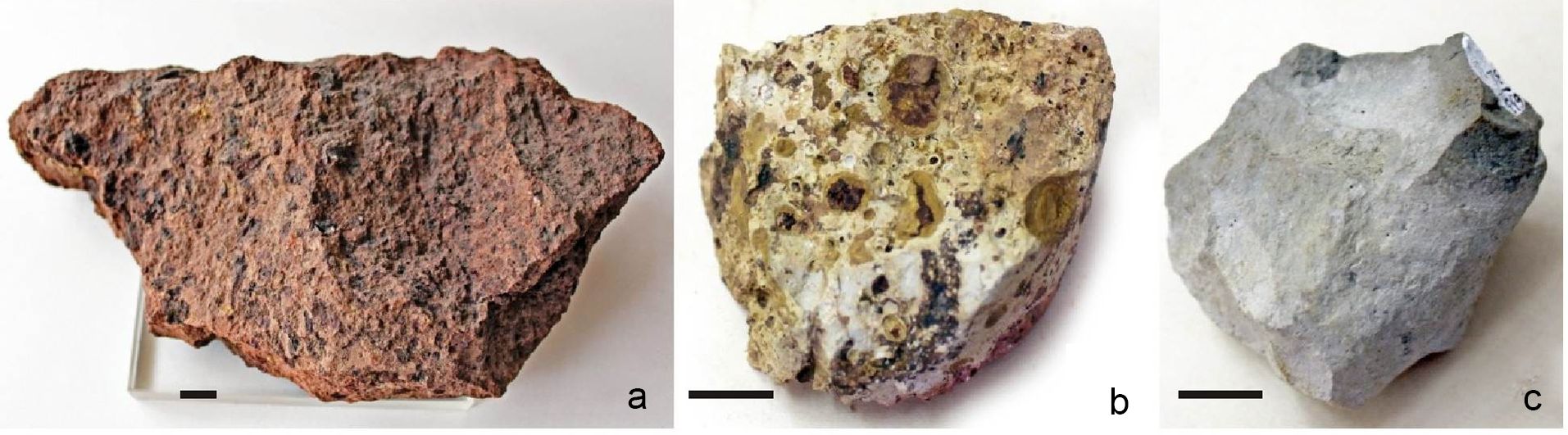 Fig. 3. Lithological varieties of South Timan bauxites: a — mudstone, № 576/19; b — rocky, № 553/163; c — dry, № 576/12. Scale bar — 1 cm
