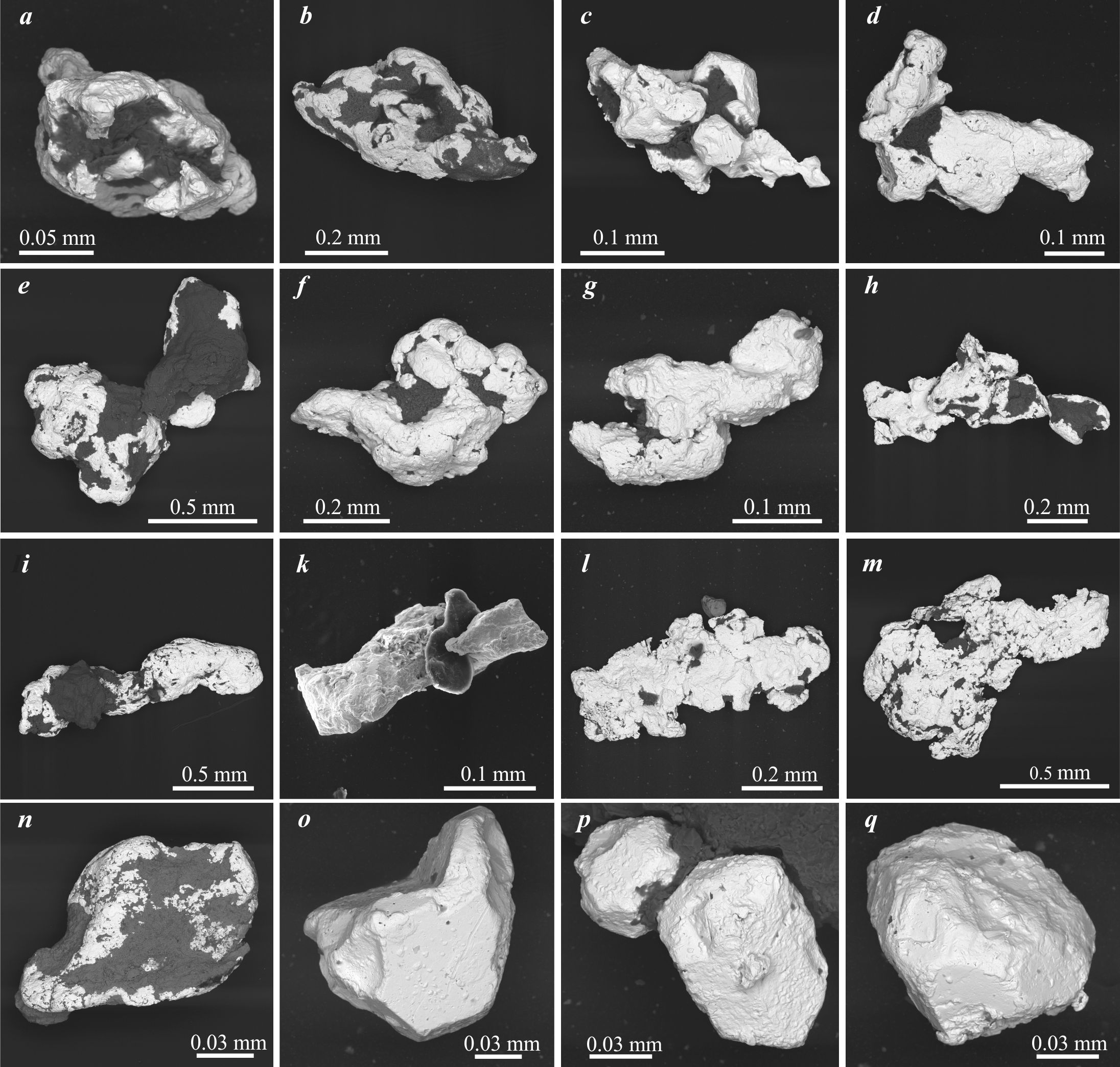 a, b — lump-shaped; c—h — complex; i, k — rod-shaped; l, m, n — lamellar; o, p, q — hypidiomorphic. Images were taken in BSE mode