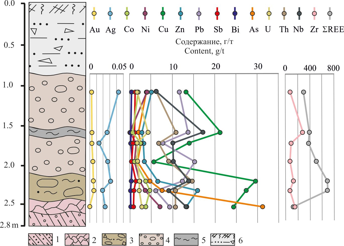 Рис. 15. График распределения золота и сопутствующих элементов по разрезу. Условные обозначения для литологической колонки см. на рис. 2