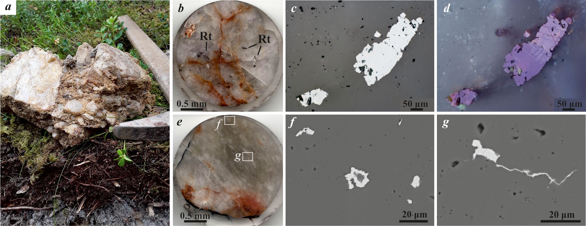 Рис. 16. Обломки жильного кварца (а). Включения в нём рутила (с, d) и пирита (f, g): b—e — оптические изображения; с — николи параллельны, d — николи скрещены; f, g — СЭМ-изображения в режиме BSE. Rt — рутил