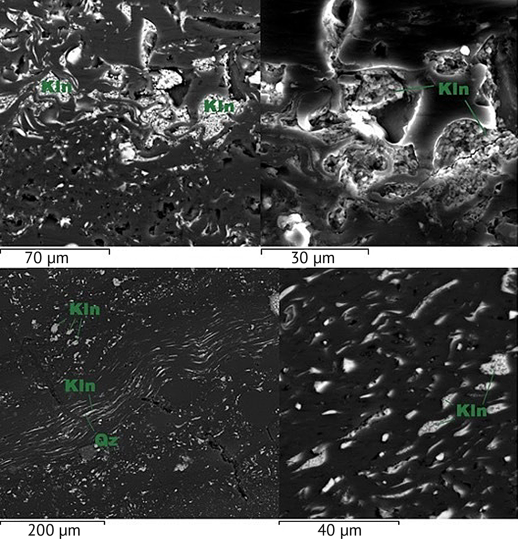 Минеральная матрица представлена преимущественно каолинитом. Каолинит заполняет клеточные полости, встречается в виде линз, прослоек, тонкодисперсных частиц (рис. 4), а также выступает цементирующим веществом во вмещающей уголь породе. Зачастую наблюдаются микропереслаивания угля и минеральных агрегатов, содержащих каолинит и кварц.