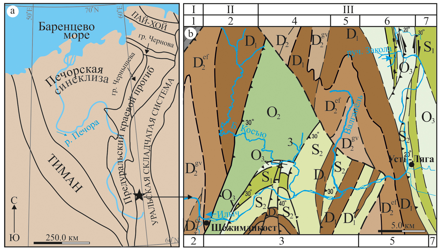 Рис. 1. Геологическое строение района исследований: a — местонахождение изученного разреза на территории Тимано-Североуральского региона; b — геологическая карта северной части Верхнепечорского поперечного опускания и её тектоническое районирование (по: Юдин, 1983; Шмелёва, Пономаренко, 2023): подзоны Елецкой (известняковой) структурно-формационной зоны Урала: I — западная (1 — Патракарьемская антиклиналь), II — центральная (2 — Усть-Шежимская синклиналь, 3 — Косъю-Уньинская синклиналь), III — восточная (4 — Эбельизская антиклиналь, 5 — Валганская синклиналь, 6 — Шантымская антиклиналь, 7 — Шантымвожская антиклиналь)