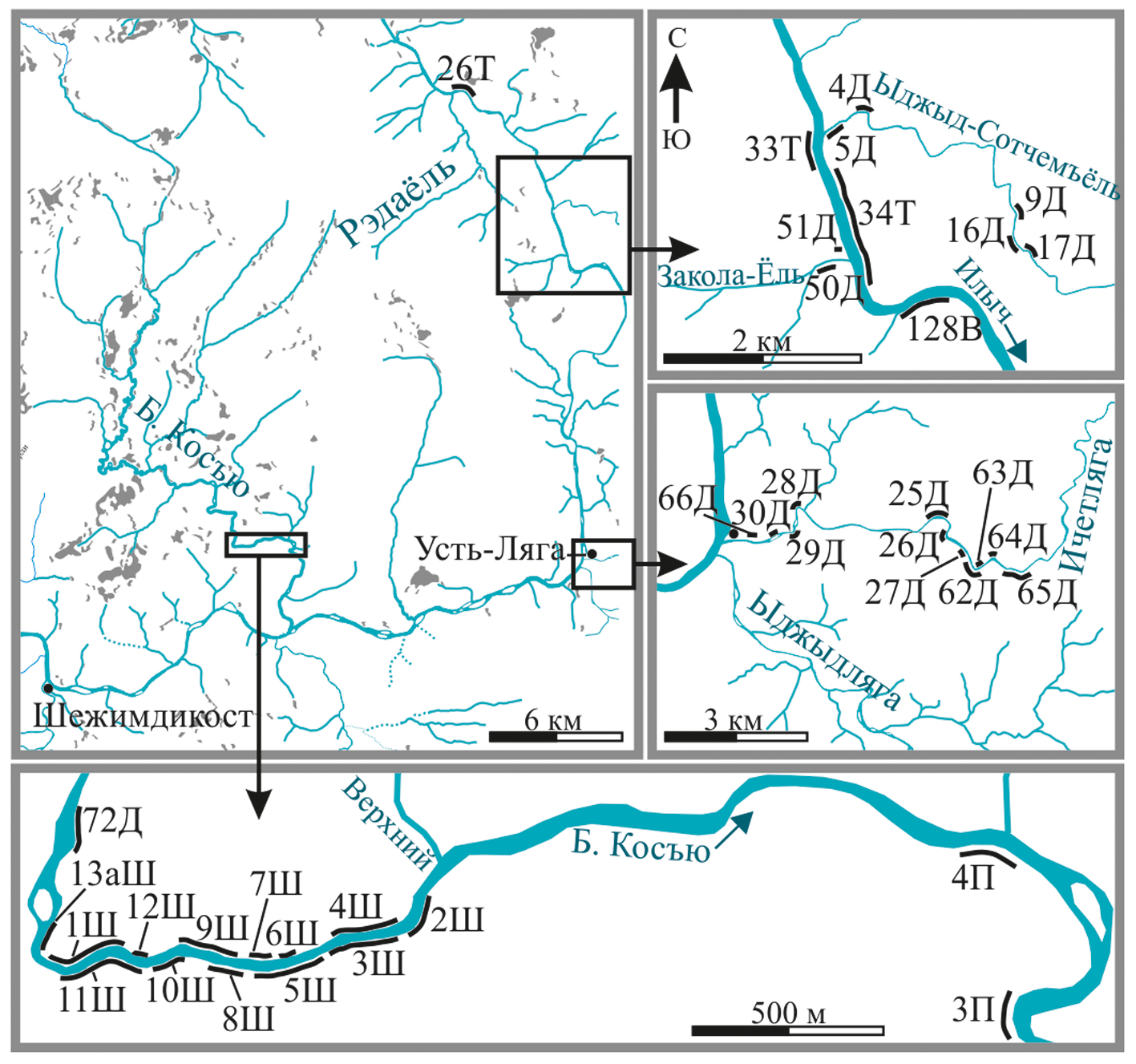 Карбонатные отложения верхнего ордовика (шежимский фациальный комплекс) развиты в бассейне среднего течения р. Илыч, на ее широтном отрезке и на р. Б. Косъю (правый приток р. Илыч). Эти отложения представлены рифом Большая Косъю, яптикшорской свитой катийского яруса и верхнеручейной свитой хирнантского яруса.