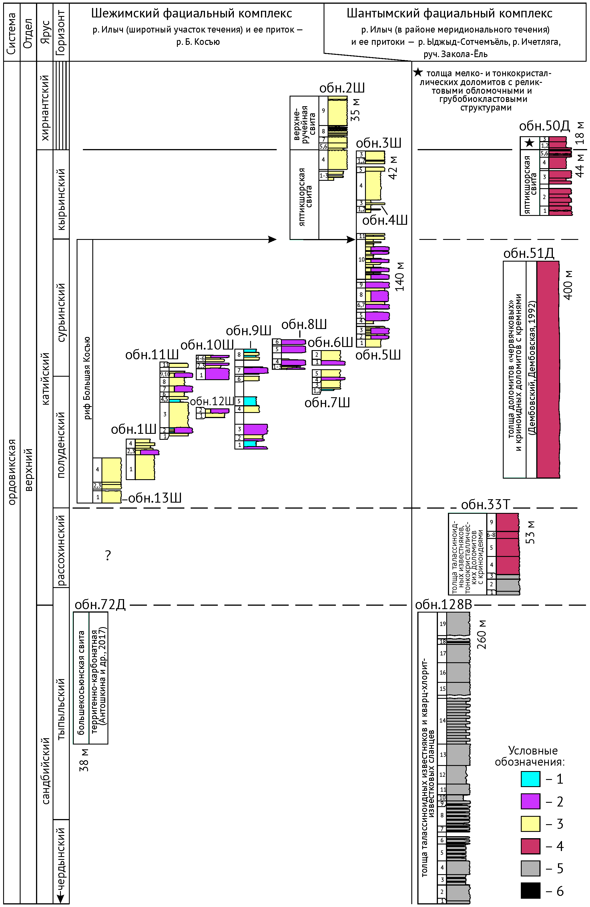 Стратиграфическая и корреляционная схемы верхнеордовикских отложений, приведенные в работе, составлены на основании материалов автора, литературных данных и полевых материалов предшественников для двух фациальных комплексов, выделенных В. А. Варсанофьевой (1940), — западного мелководного (шежимского) и восточного глубоководного (шантымского) (рис. 2, 3).