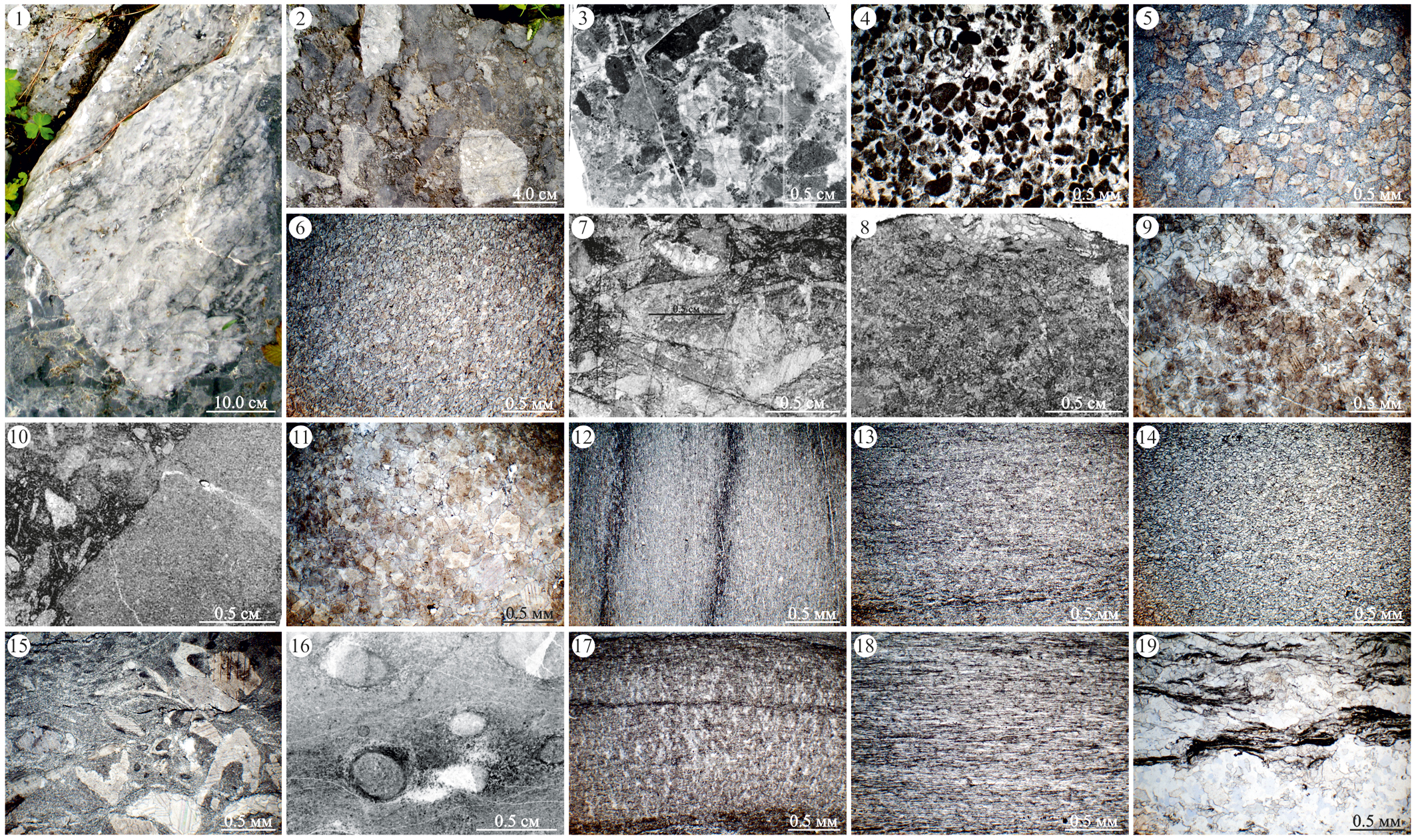 1—4 — известняки механогенные литокластовые: 1 — брекчия глыбовая известняковая доломитистая (ЛТ-18), 2 — конглобрекчия грубообломочная известняковая доломитистая (ЛТ-19), 3 — брекчия мелкообломочная известняковая (ЛТ-20), 4 — песчаник известняковый средне- и крупнозернистый (ЛТ-21); 5—11 — доломиты замещения: 5 — мелко- и микрокристаллический известковистый (ЛТ-22), 6 — тонкокристаллический (ЛТ-23), 7 — тонкокристаллический с реликтовой грубобиокластовой структурой (ЛТ-24), 8 — мелкокристаллический с реликтовой крупнобиокластовой структурой (ЛТ-25), 9 — мелкокристаллический с реликтовой сгустковой структурой (ЛТ-26), 10 — мелкокристаллический с реликтовой обломочной структурой (ЛТ-27), 11 — мелко- и среднекристаллический с реликтовой средне- и грубобиокластовой структурой (ЛТ-28); 12—17 — известняки кристаллические: 12 — криптокристаллический доломитистый (ЛТ-29), 13 — микрокристаллический (ЛТ-30), 14 — тонкокристаллический доломитистый (ЛТ-31), 15 — тонкокристаллический с биокластовым материалом, доломитистый (ЛТ-32), 16 — тонкокристаллический с ходами роющих организмов (ЛТ-33), 17 — тонкокристаллический с реликтовой микросгустковой структурой, доломитистый (ЛТ-34); 18, 19 — известковые сланцы: 18 — хлорит-известковый (ЛТ-35), 19 — кварц-хлорит-известковый (ЛТ-36)