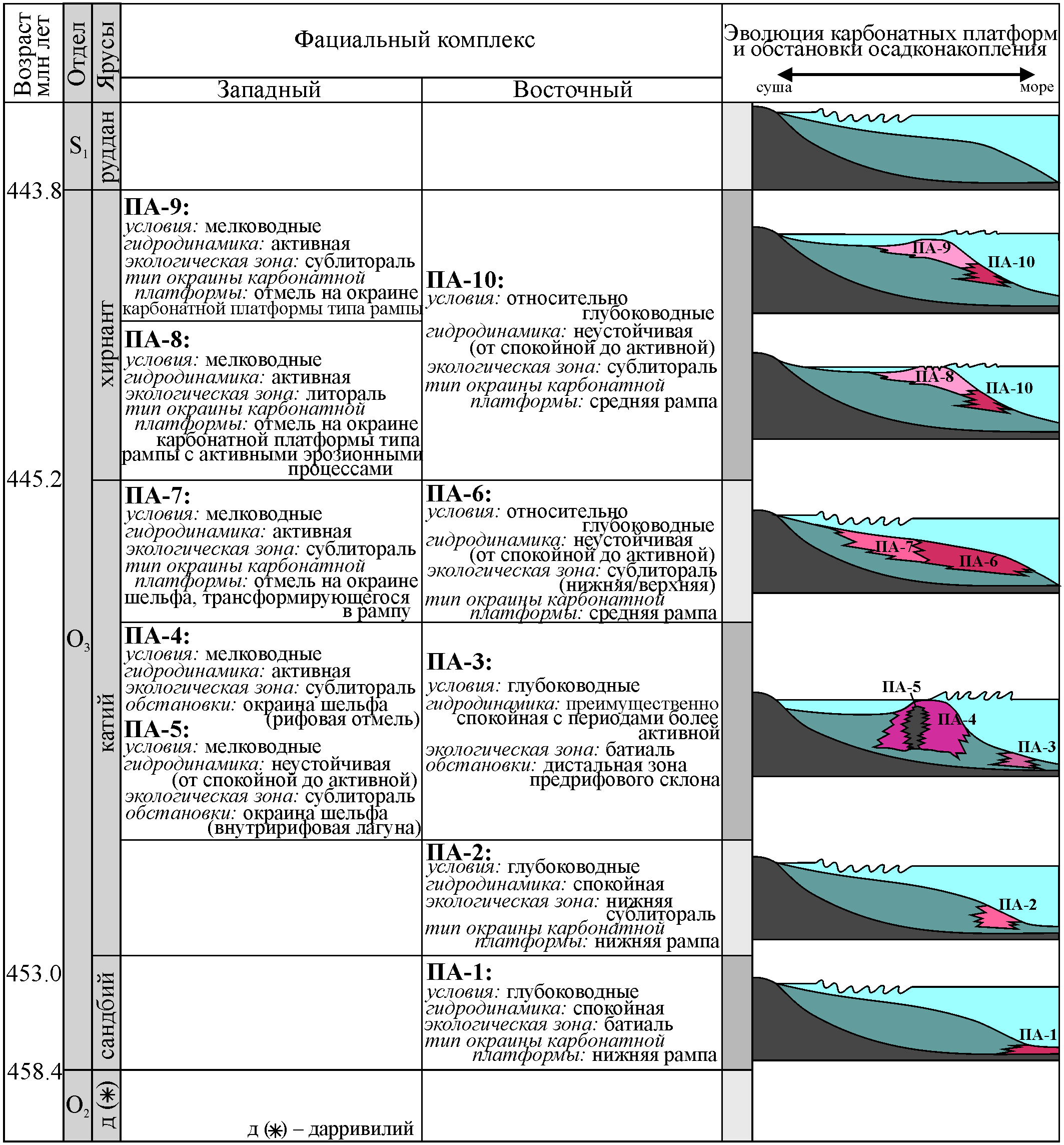 ПА-1. Парагенетическая ассоциация микро- и тонкокристаллических известняков и хлорит-известковых и кварц-хлорит-известковых сланцев, по стратиграфическому объему соответствующая сандбийским отложениям восточного фациального комплекса (260 м). Имеет следующие характерные признаки: большая мощность, темно-серый цвет, неоднородность строения, известково-глинистый состав, тонкослоистая и сланцеватая текстура пород, микро- и тонкокристаллическая структура, скудность органогенного материала и обилие ходов роющих организмов. Этот парагенез характеризует образование отложений в глубоководных условиях со спокойной гидродинамикой, вероятнее всего в обстановках батиальной зоны нижней рампы.