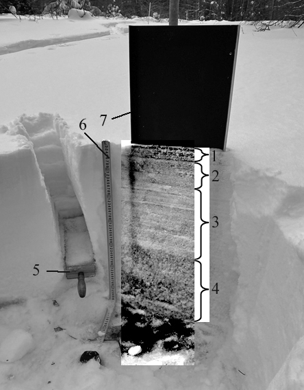 Рис. 1. Апробация бороздового снегоотборника-плотномера на ключевом участке «Ботсад СГУ» в сопряжении со светопоглощающим экраном для визуализации стратиграфии снежной толщи: 1 — свежевыпавший снег, 2 — мелкозернистый снег, 3 — среднезернистый снег, 4 — горизонт глубинной изморози, 5 — бороздовый снегоотборник-плотномер, 6 — рулетка, 7 — светопоглощающий экран