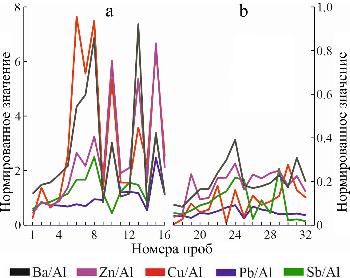 Однако в целом можно сказать, что метод ступенчатого центрифугирования может рассматриваться как вспомогательный прием при сравнительной характеристике распределения элементов-примесей в снеговой воде при изучении химического состава снежного покрова, формирующегося в пределах рудного поля. Но при этом необходимо принять во внимание возможность затушевывания полезного сигнала рудной аномалии наложением другого сигнала, связанного с атмосферным загрязнением снега. В связи с этим возникает проблема: как отличить полезный сигнал рудной аномалии от флуктуаций природного геохимического фона? При том что на эти флуктуации может оказывать влияние зимнее аэрозольное поле, формирование которого связано не только с дальним переносом влагосодержащих воздушных масс, но и с локальными переносом эоловой пыли (Евсеева и др., 2020). В рамках данной работы указанная проблема решается нормированием значений концентраций индикаторной группы элементов-примесей с использованием алюминия — тероморфного элемента литосферы (рис. 5).