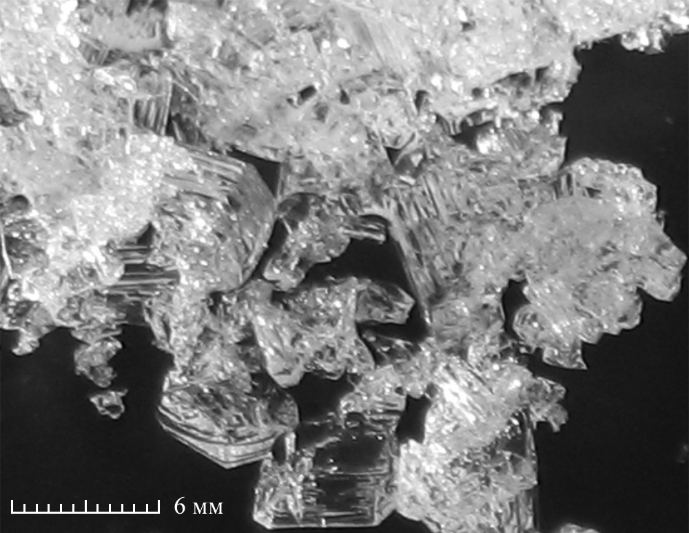 Рис. 6. Ледяные пирамидальные кристаллы глубинной изморози со штриховкой Фореля на гранях (фото М. П. Тентюкова)