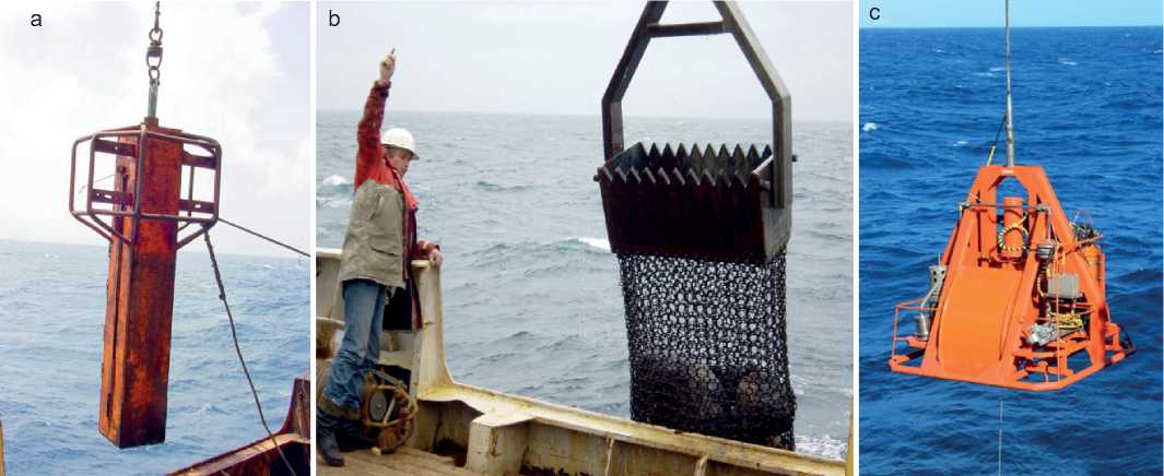 Рис. 2. Аппаратура для подъёма вещества со дна: а — коробчатый пробоотборник; b — скальная драга; c — грейфер с видеокамерой
