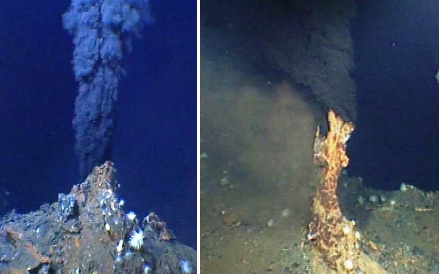 Рис. 3. Начальная стадия формирования (а) и окончательный вид (b) активной трубы черного курильщика. Стоп-кадры видеосъёмки на рудном поле Ашадзе-1 в ходе российско-французской экспедиции Serpentine, 2007