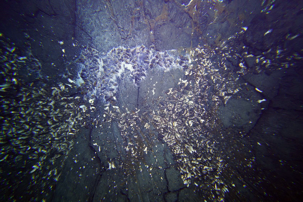 Рис. 4. Скопление типичной гидротермальной фауны (двустворчатых моллюсков) на базальтах, практически лишённых осадков. Кальдера вулкана Пюи де Фоль. Фотопрофиль 45L024t